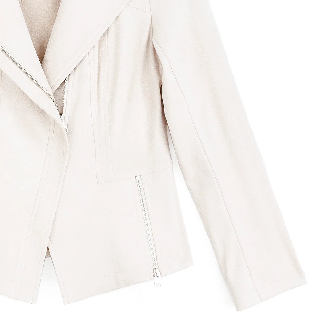 Our Soft Suede Signature Jacket is an elevated essential reimagined with a refined, contemporary edge! This jacket features a notched lapel with upright collar, long sleeves, a silver asymmetrical zip closure, faux pocket zipper slits, and complementary detailed front and backstitching.