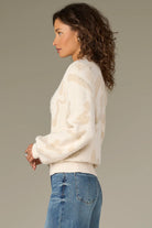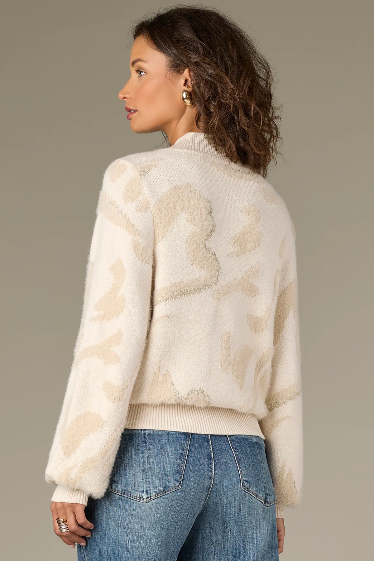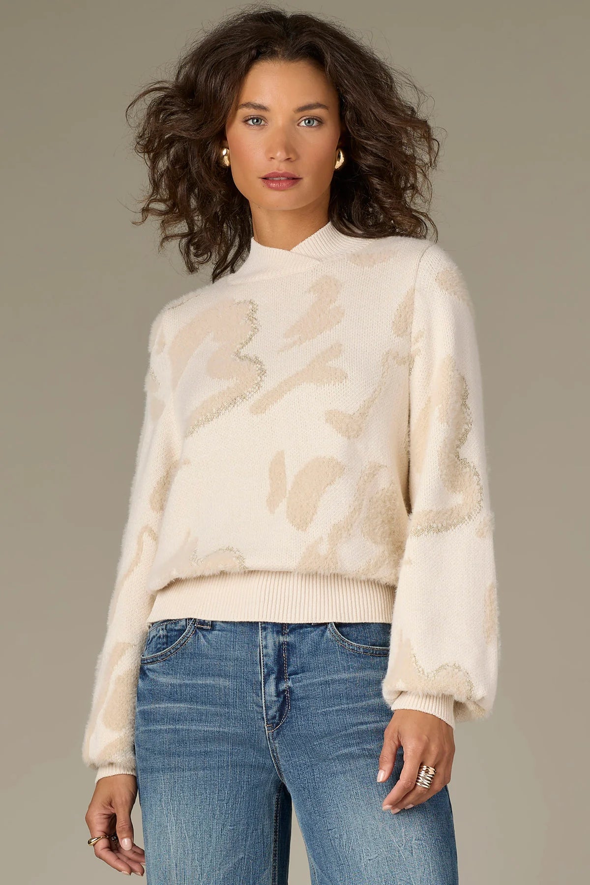 Soft, cozy, and made for layered looks, this pull over sweater is a wardrobe staple. It’s designed with long blouson sleeves, an overlap mock neck, and an abstract metallic jacquard print.