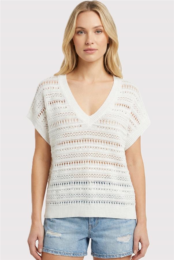 Breezy and effortlessly chic, the V Neck Sleeveless Open Knit Top is perfect for layering or wearing on its own. Its open knit design and sleeveless silhouette create a lightweight, relaxed fit ideal for warm days. Pair with denim, skirts, or shorts for a versatile, easygoing look.