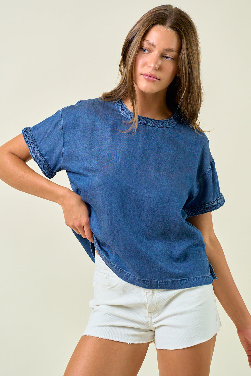 *FINAL SALE* Short Sleeve Denim Top with Braided Trim Detail