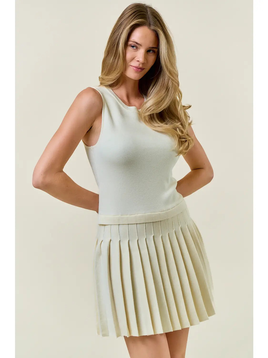 This pleated knit mini dress features a classic sleeveless, tank-style bodice with a fitted waist that flows into a finely pleated, flared mini skirt. Crafted from comfortable knit material, this dress offers a flattering silhouette that combines elegant pleating with a playful mini-length hem. It is a versatile and stylish piece that can be dressed up or down for any occasion.