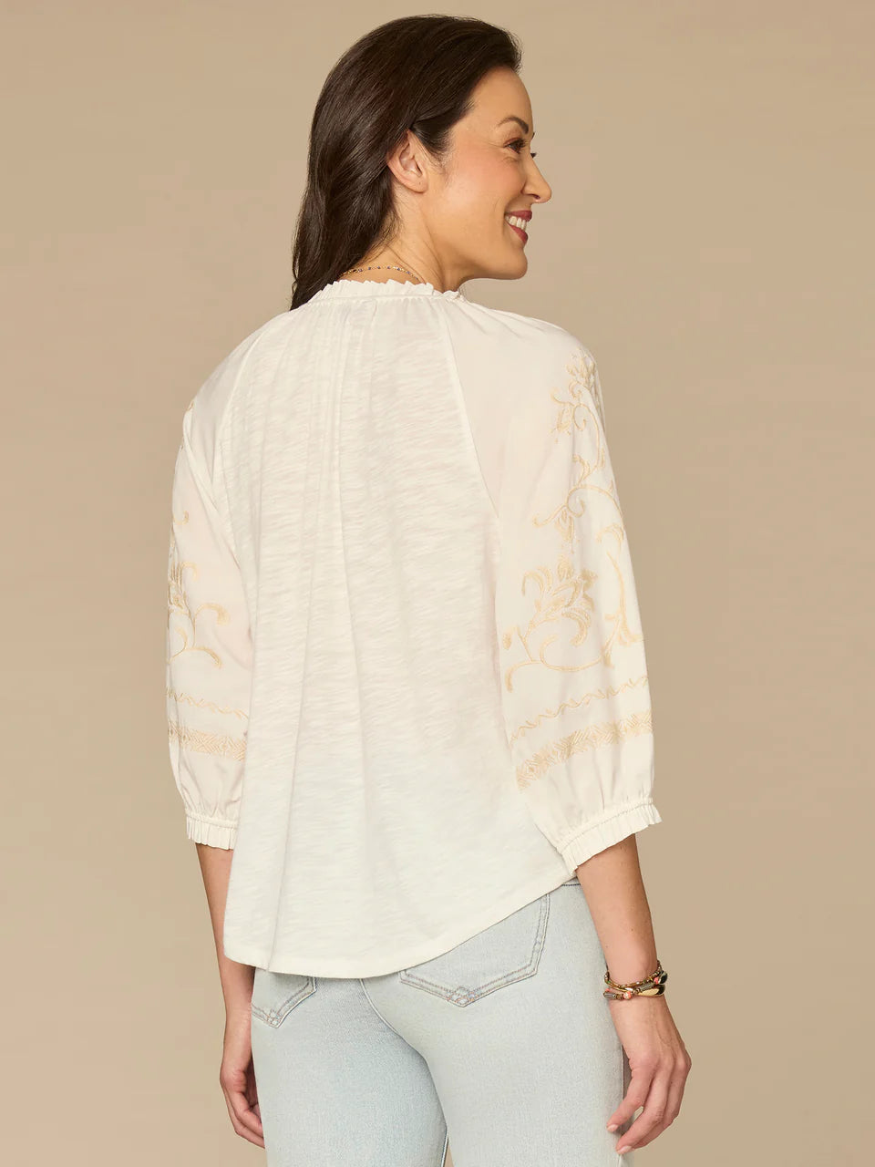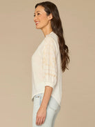 Even neutrals can stand out. This off white mixed media top has three quarter blouson sleeves, a ruffle stand collar, embroidery, and a floral buttoned front.