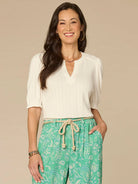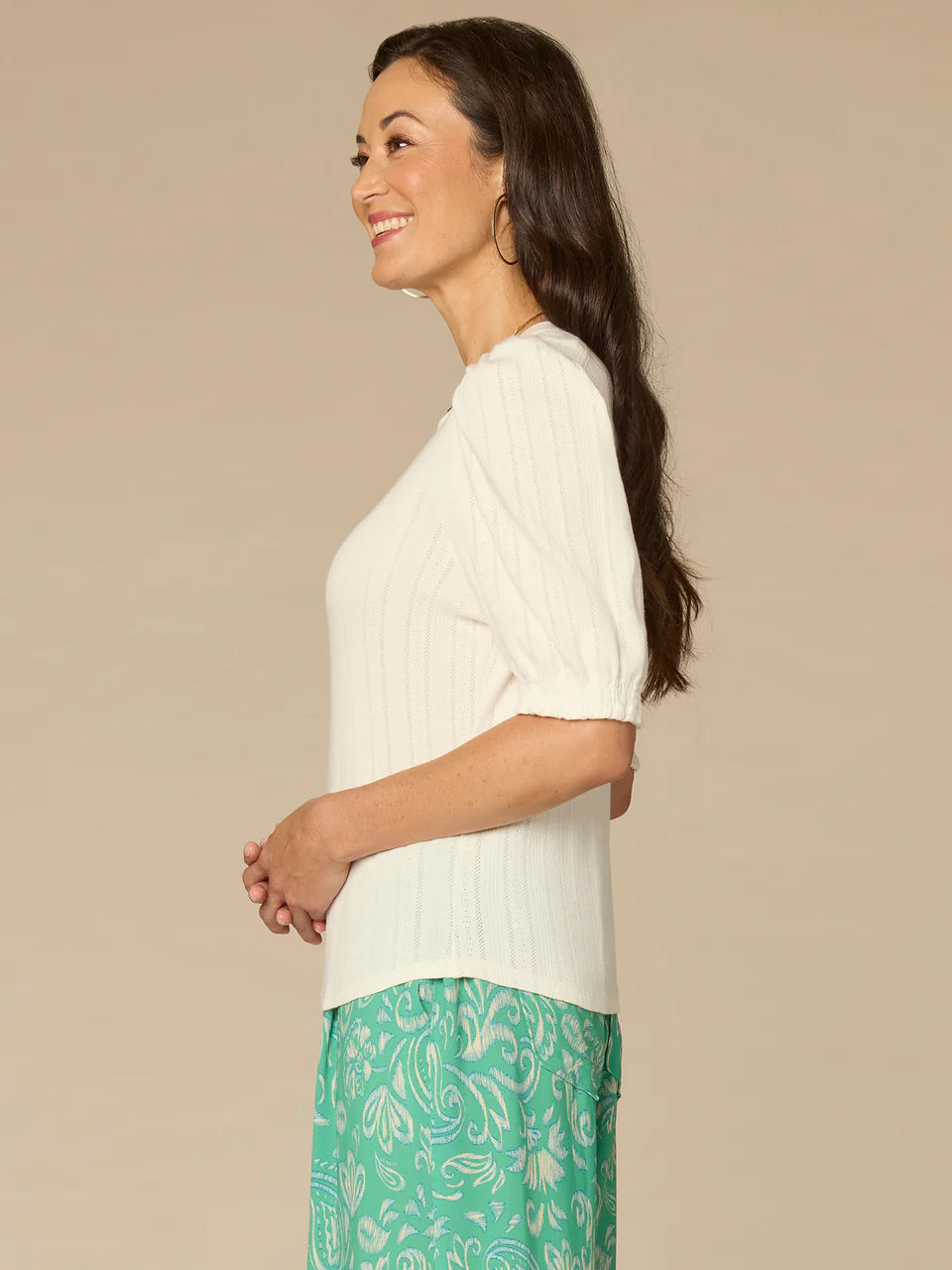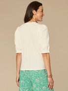 Elbow puff sleeves, a mandarin collar, and embroidery make this knit top an instant classic. Due to the slightly sheer, open work fabric, you may want to style it with a layer underneath.