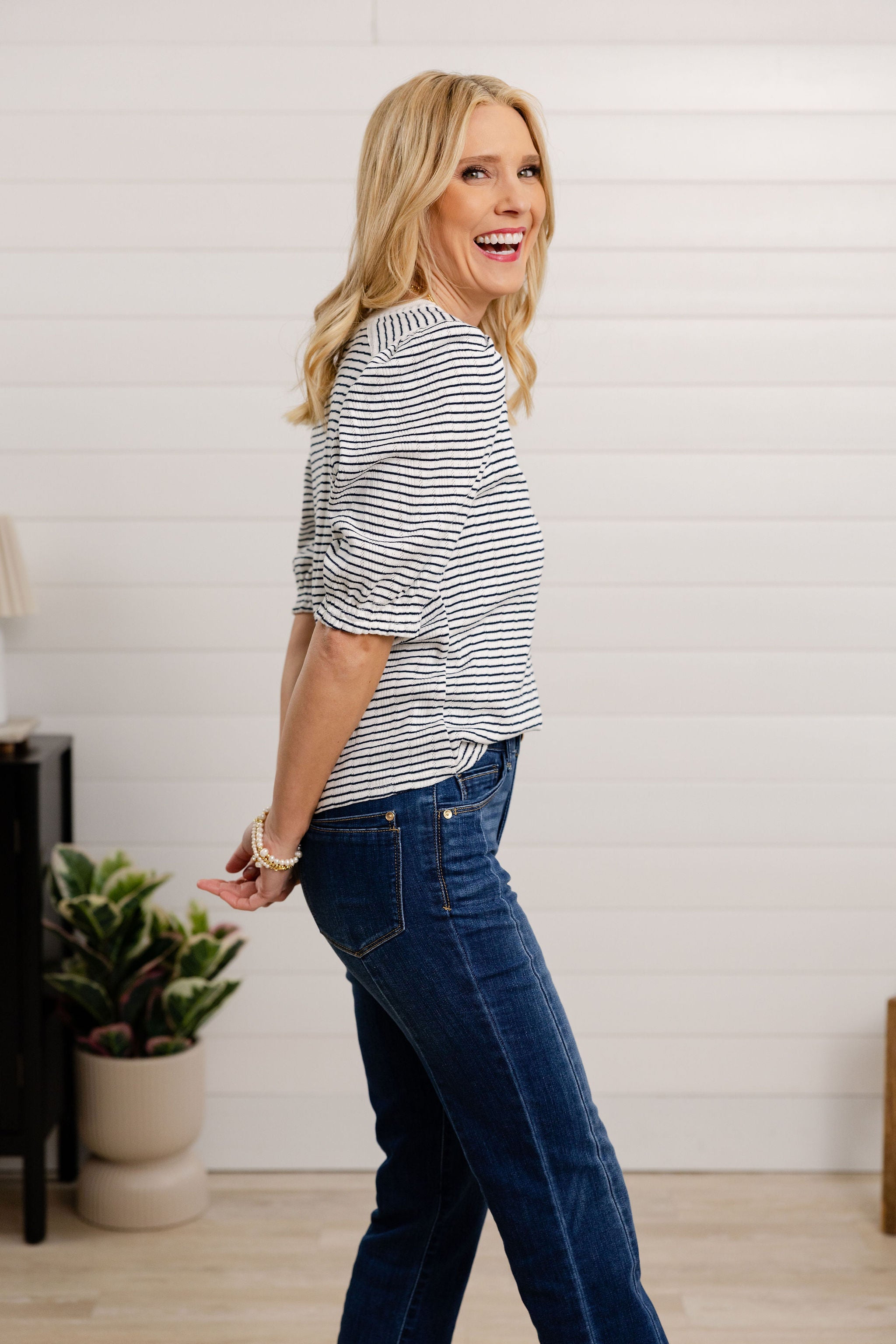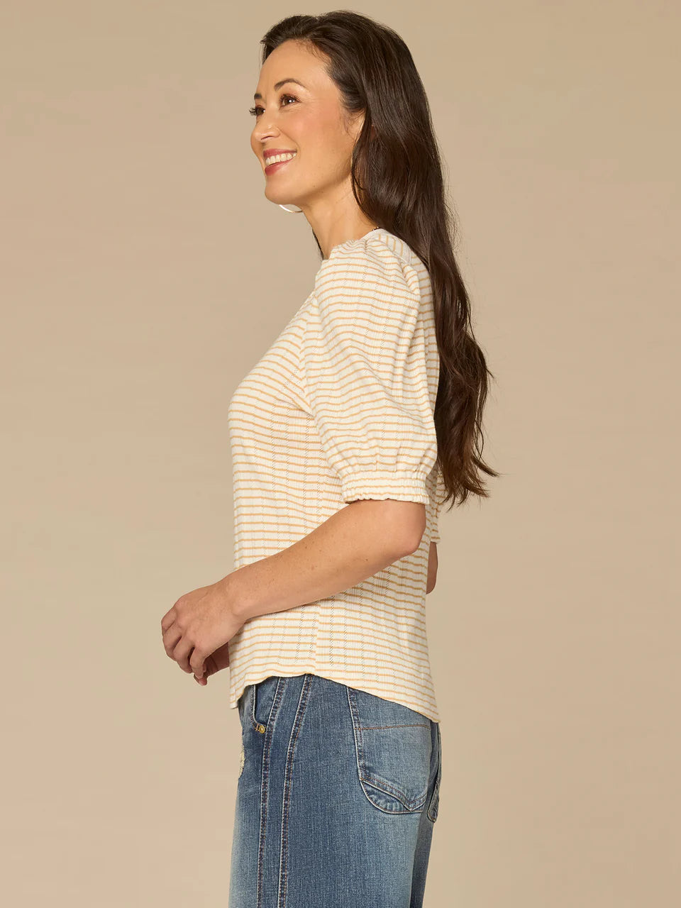 Stripes are a timeless essential. This knit top features elbow puff sleeves, a mandarin collar, contrast half placket, embroidery, and --- of course – a classic stripe print.