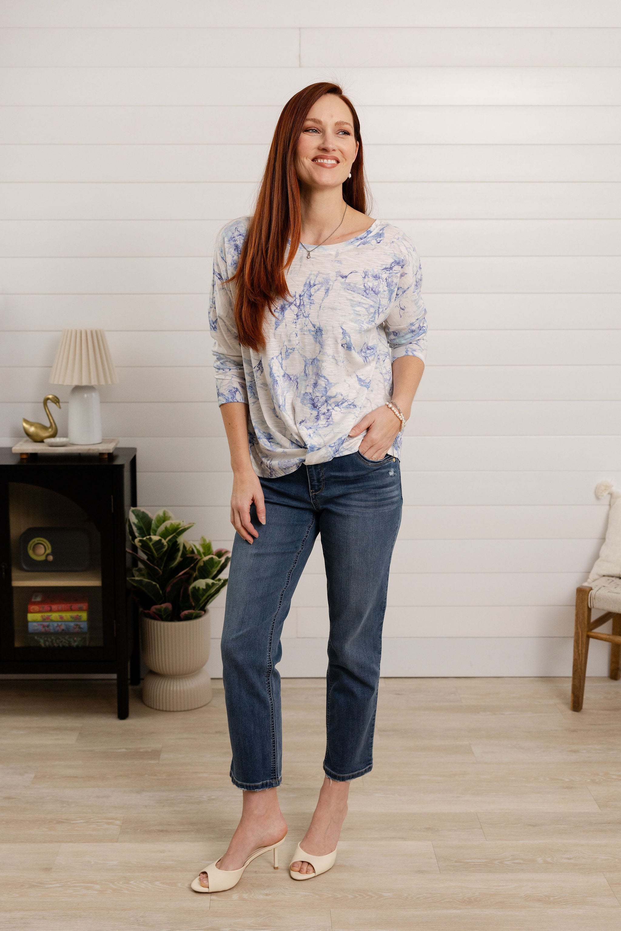 With a classic fit and on-trend marble print, you’ll reach for this knit top repeatedly. It’s also designed with three quarter drop shoulder sleeves, a scoop neck, and twist front hem.