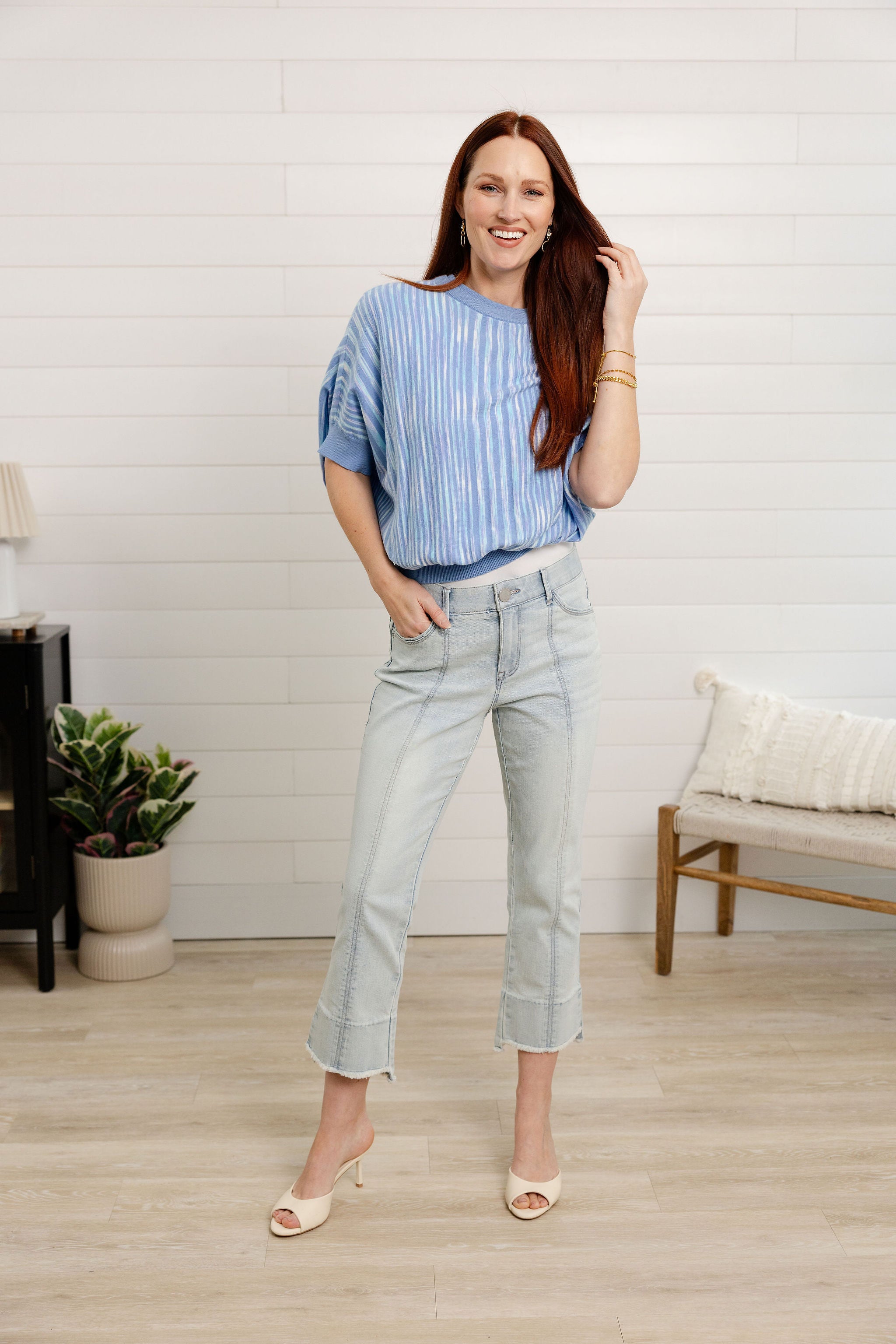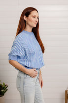 Elevate your sweater collection with this vibrant space dye style. It’s designed with short banded dolman sleeves, a double round neck, and flattering vertical stripes.