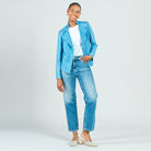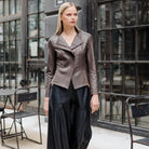 Experience our unique faux Liquid Leather Signature Jacket which is made from our beautiful signature stretch knit, extremely lightweight soft "lambskin feel" fabric with an antique-like textured matte finish. This jacket features a notched lapel with an upright collar, long sleeves, a rustic gold a-symmetrical zip closure, faux pocket slits as well as complimentary detailed front and backstitching.