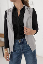 This vest is a chic and contemporary layering piece with a high-shine finish that gives it a sleek, polished look. Its tailored, fitted design flatters the figure, adding a touch of modern edge to any outfit. This vest is both stylish and versatile, perfect for elevating a casual or dressy look.