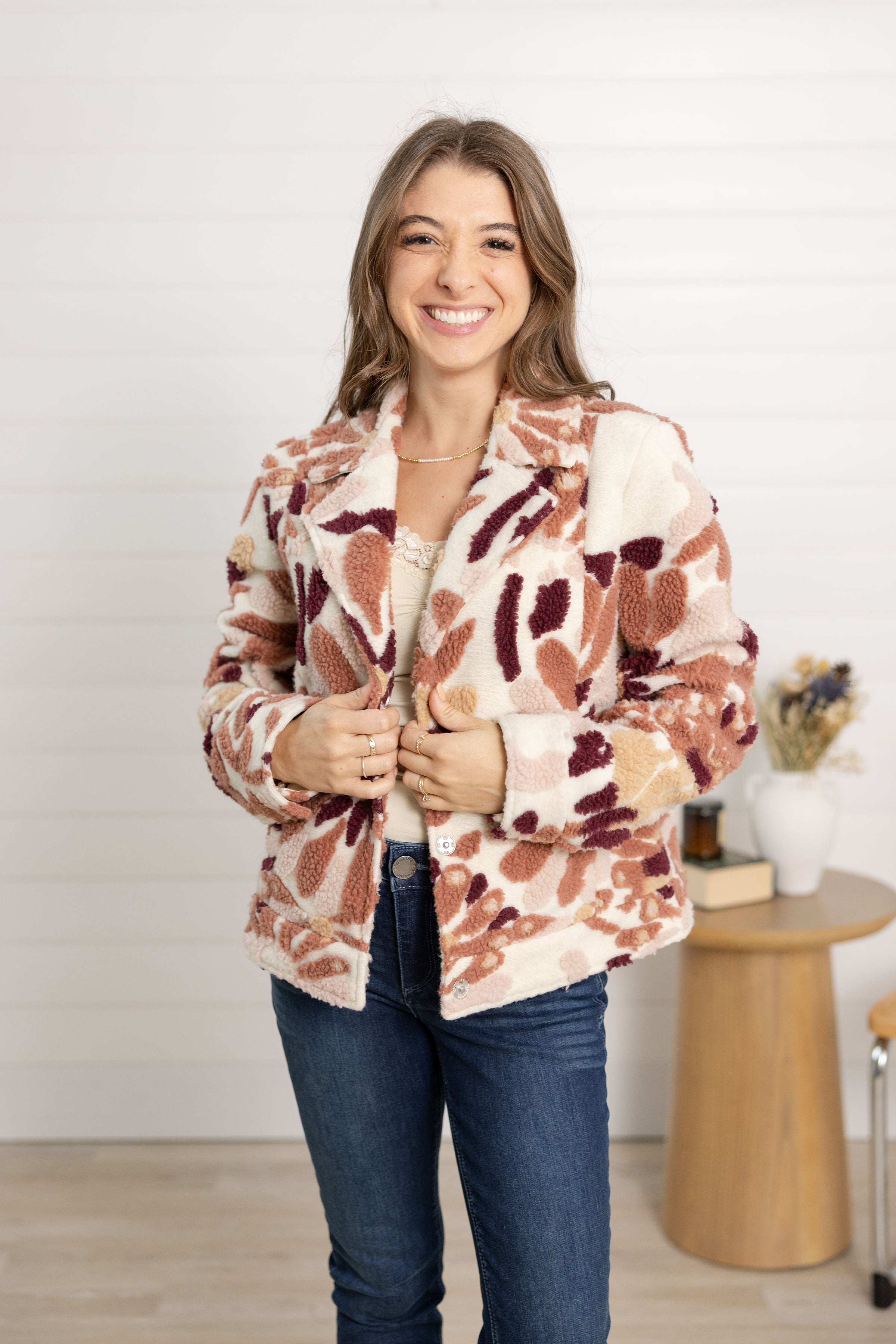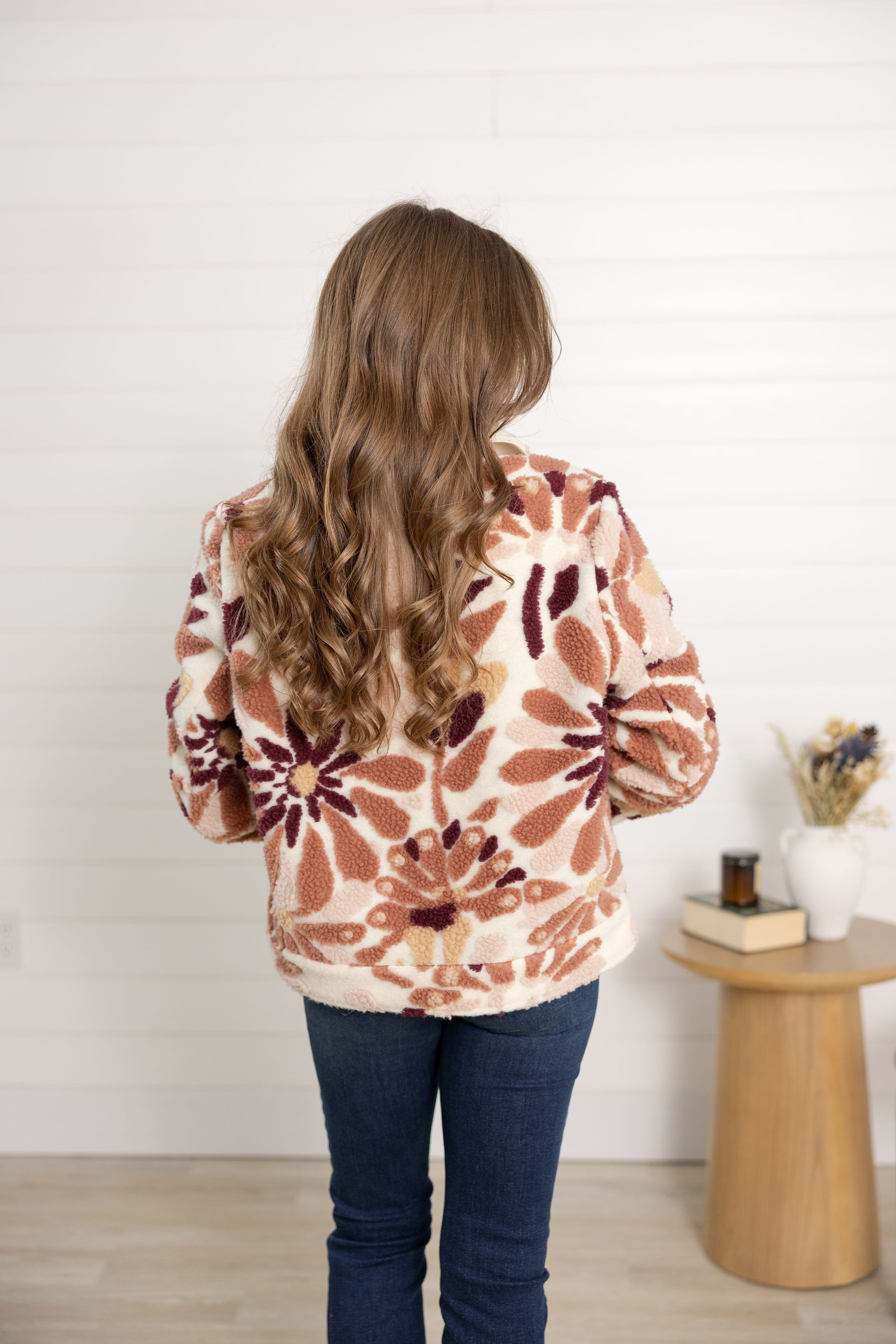 Stay cozy while making a statement in this sherpa fleece jacket featuring a soft flocked floral design. The plush fabric offers warmth and comfort, while the relaxed fit makes it perfect for layering. A stylish blend of texture and pattern, it’s an effortless piece for casual days or cozy nights.