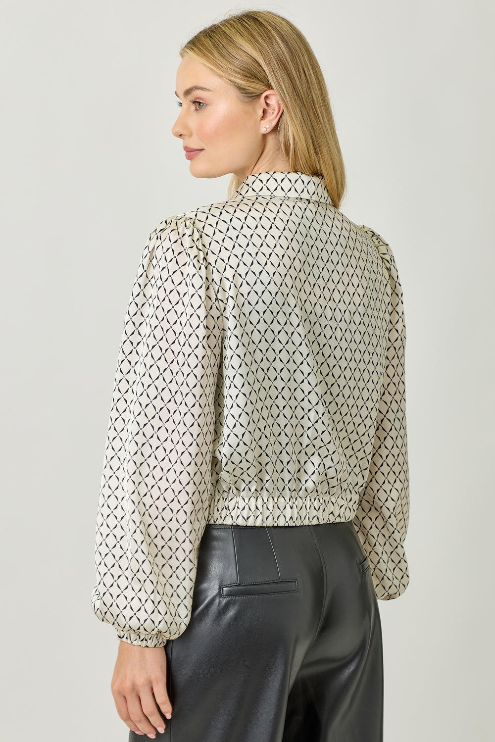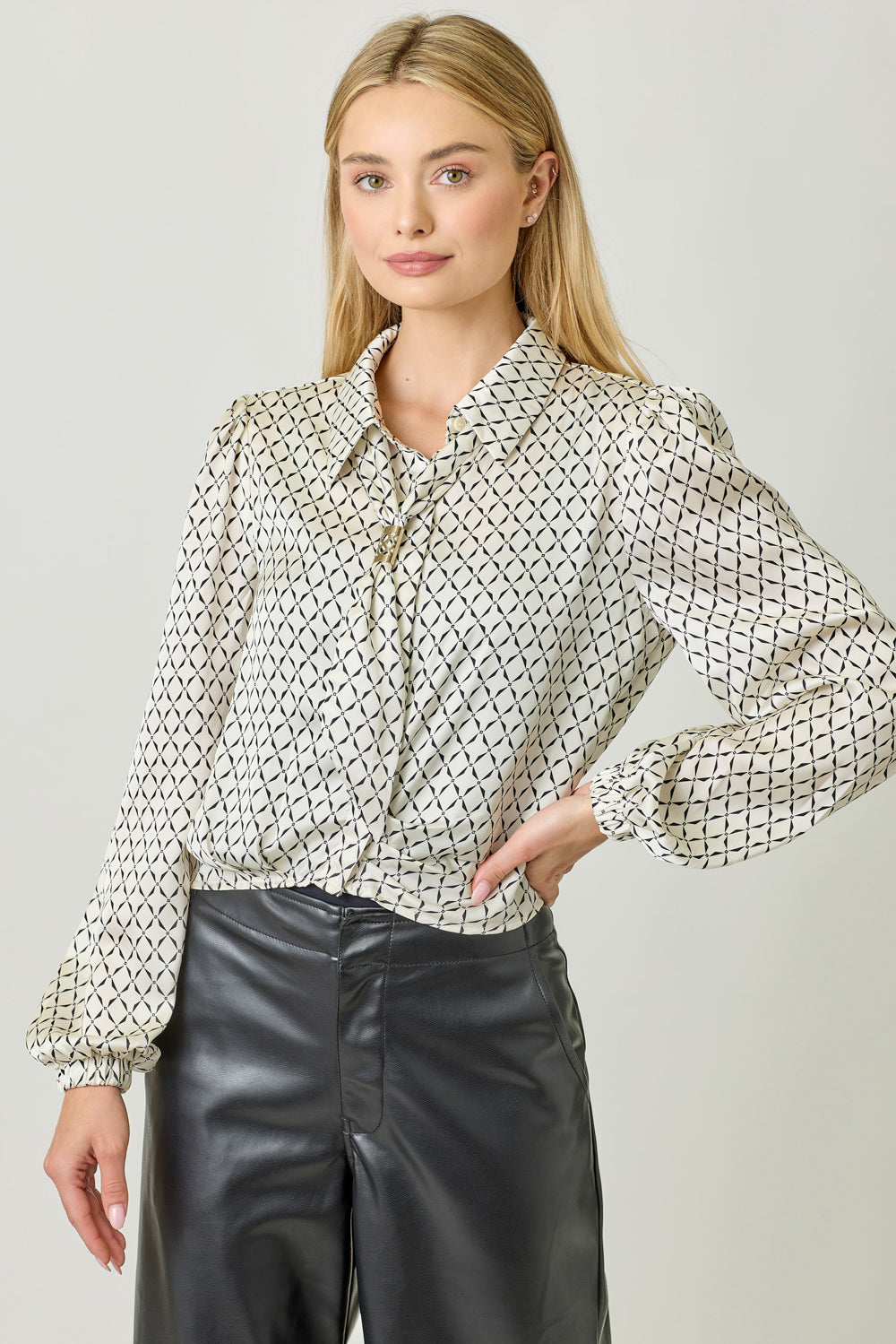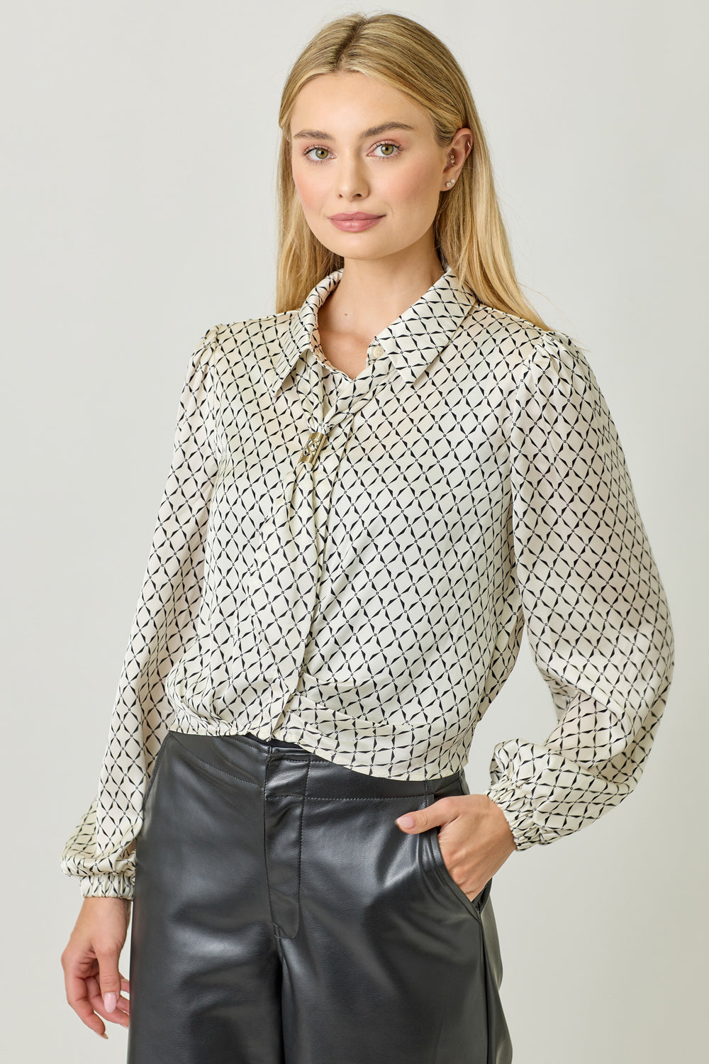 This geo print scarf blouse features a stylish elastic waistband for a flattering, tailored fit. The lightweight fabric and unique scarf detail add a touch of sophistication to your look. Perfect for pairing with trousers or skirts, it effortlessly transitions from work to weekend.
