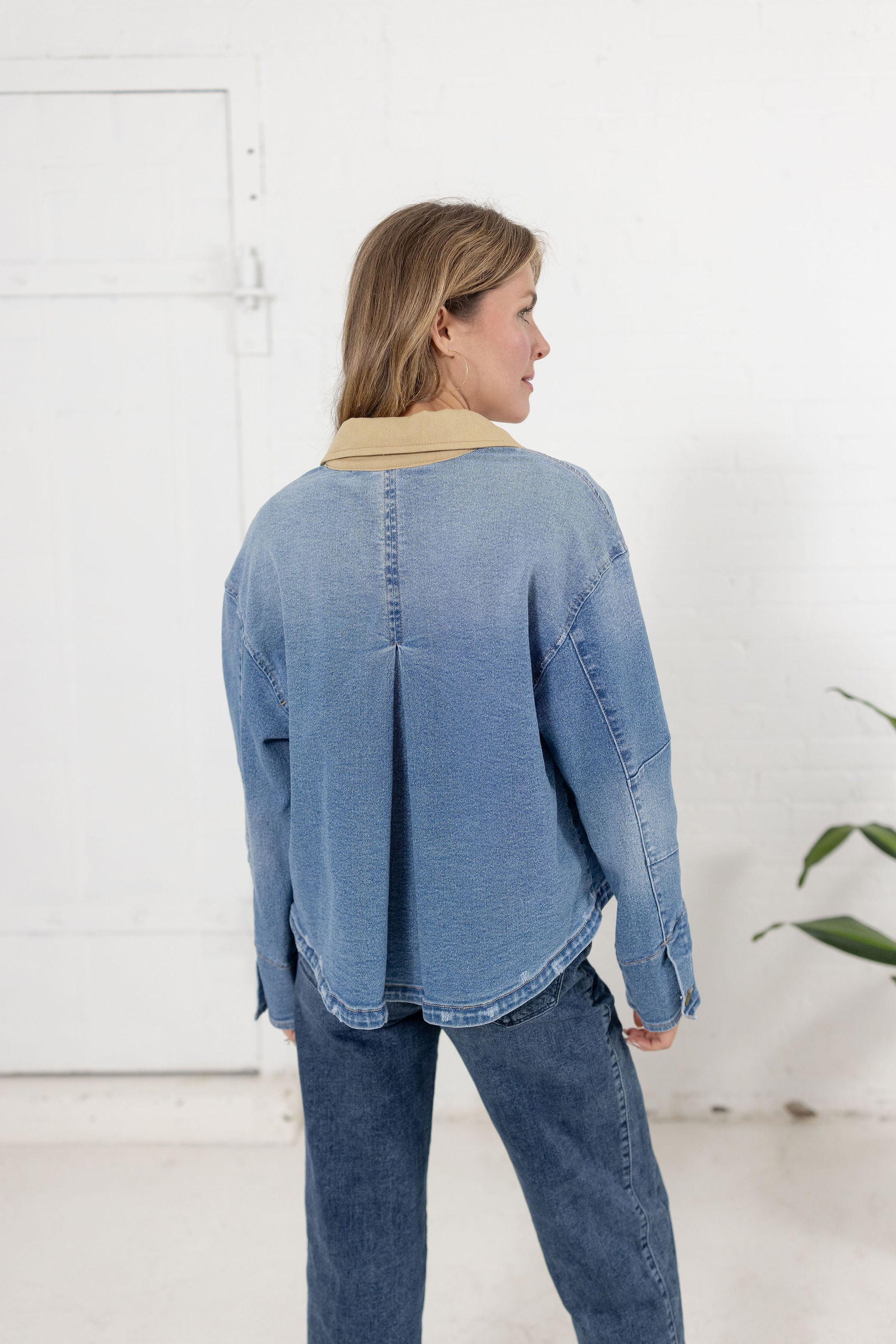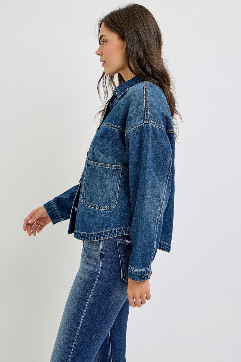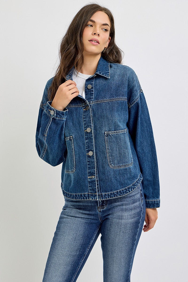Relaxed Fit Denim Jacket with Pockets and Seaming Detail - Dark