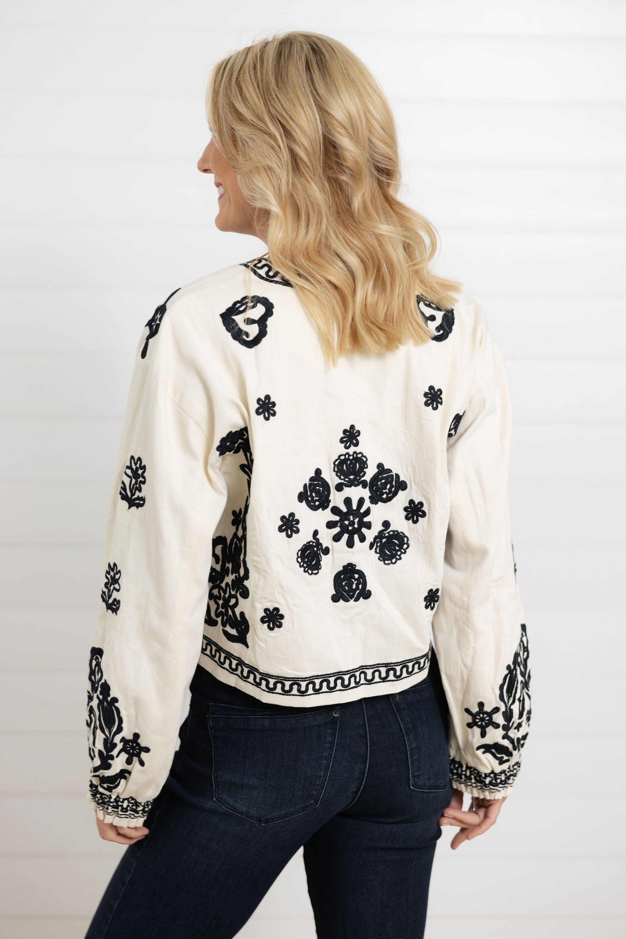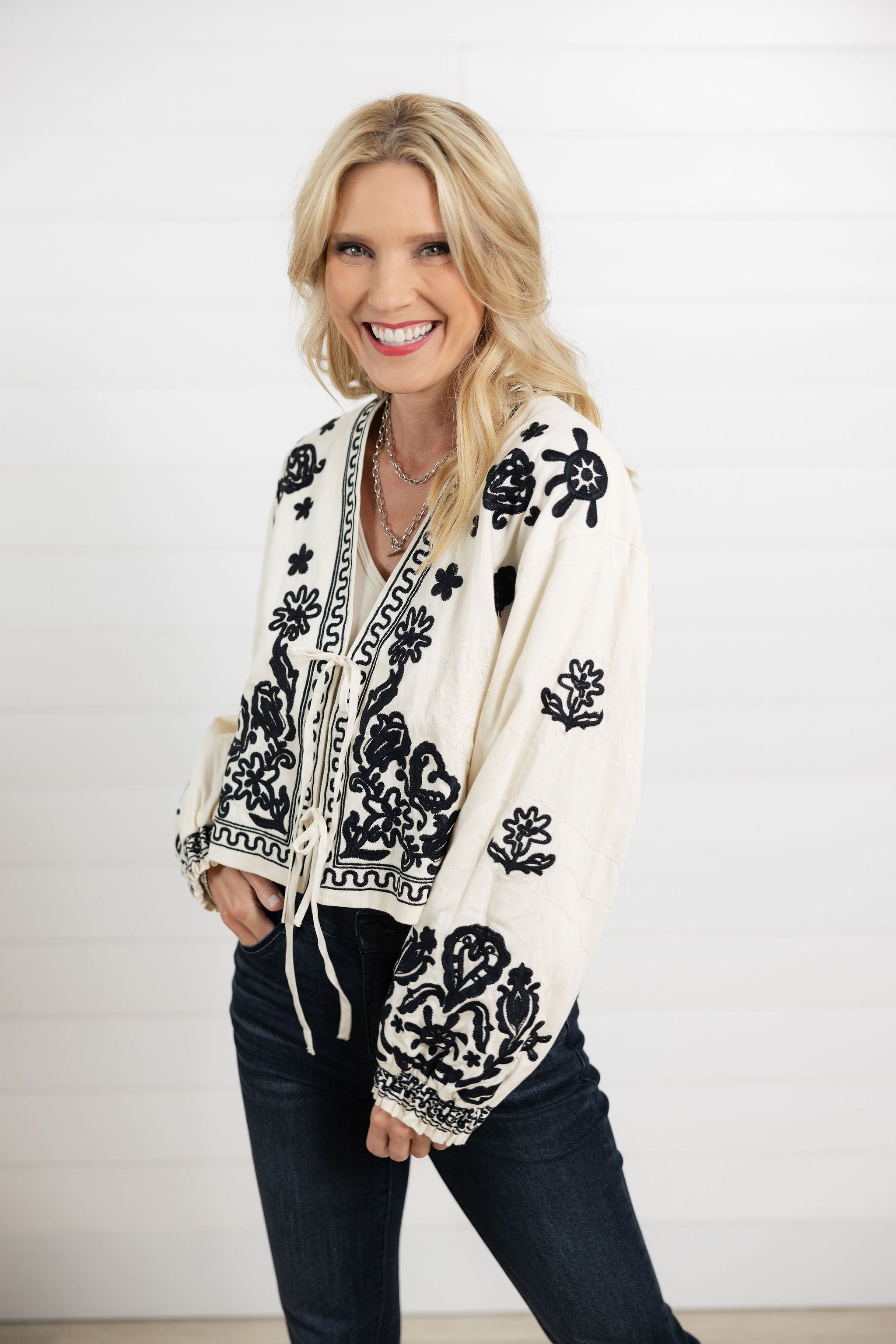 Cotton Cropped Tie Front Jacket with Embroidery Detail