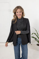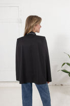 Elevate your style with this cape jacket, featuring open slit sleeves and a tailored silhouette. Its sleek, modern design adds effortless polish to both casual and dressy looks. A versatile layering piece you’ll wear season after season.