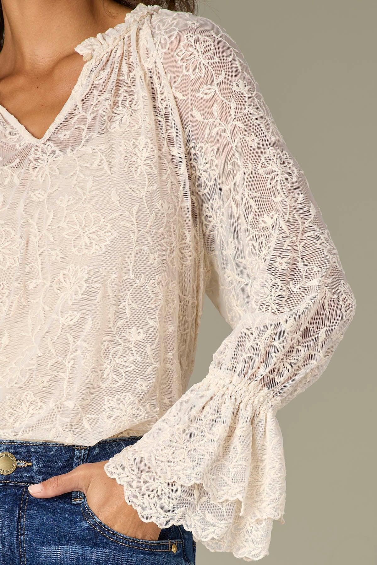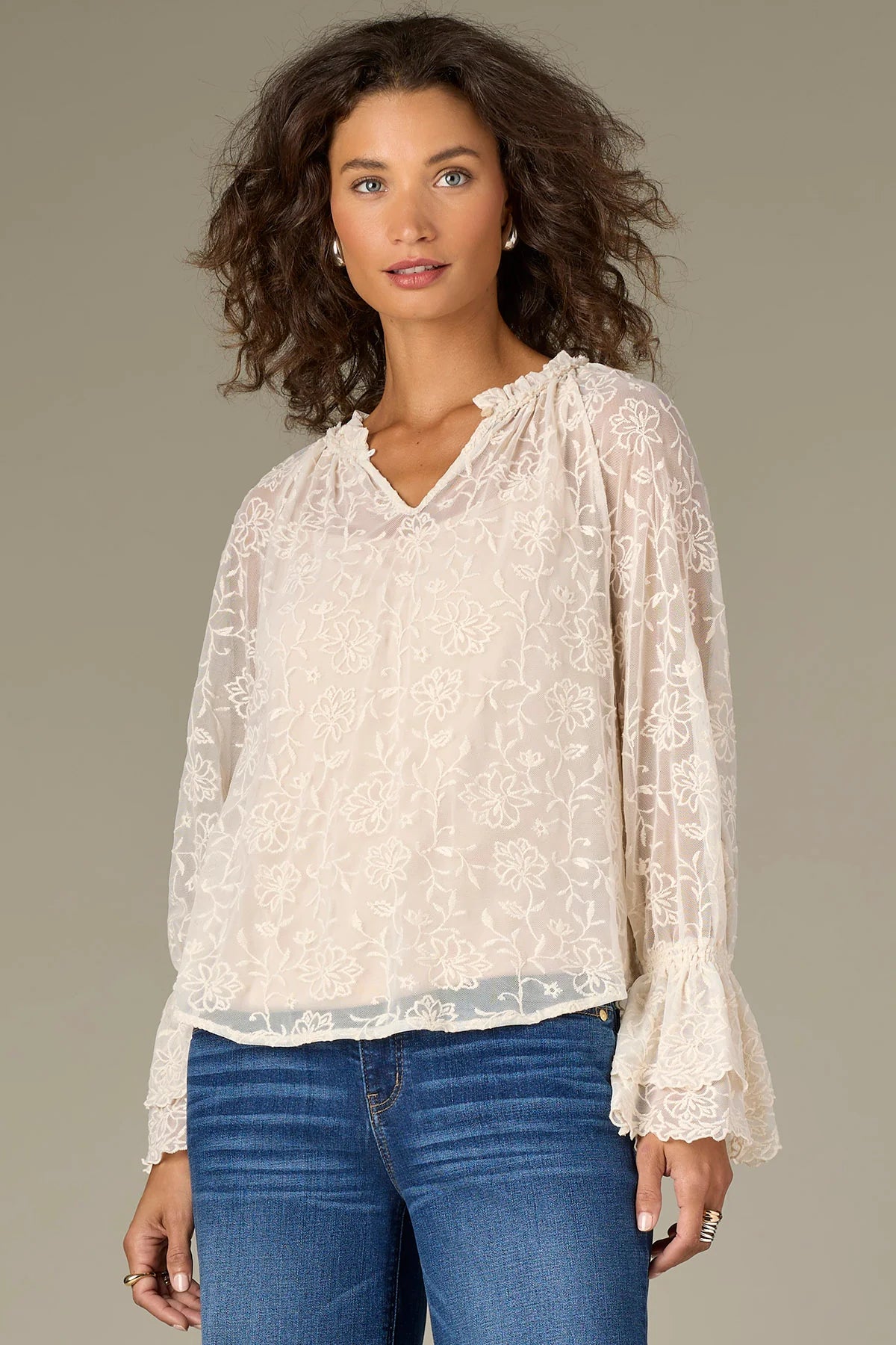 Look put together for every occasion with this woven floral lace top. Its long double flounce sleeves, ruffle edge V-neck, and scallop edge embroidery keep you looking sharp, while the included tank top layer ensures you’re covered.