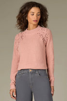 Pull this elevated sweater on and go. It has long raglan sleeves, a mock neck, modern soutache embroidery, and curled edges.