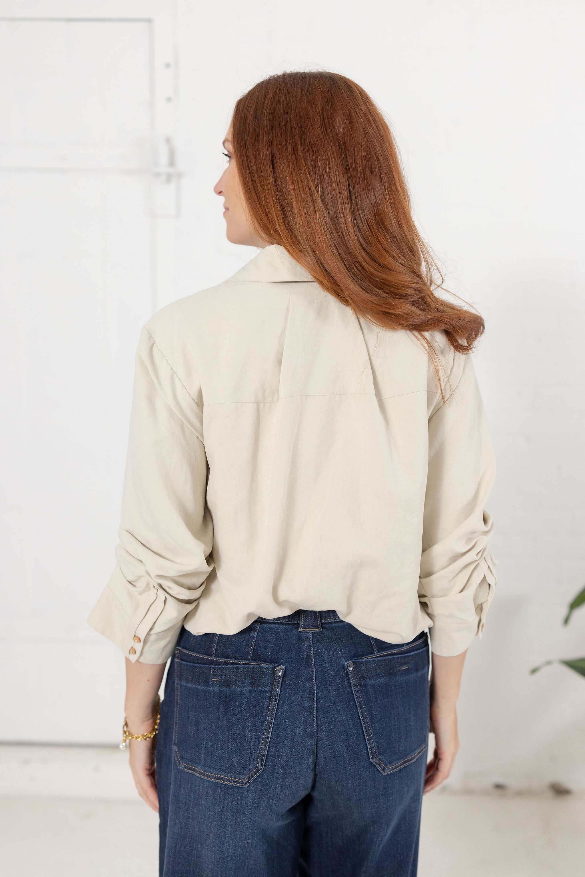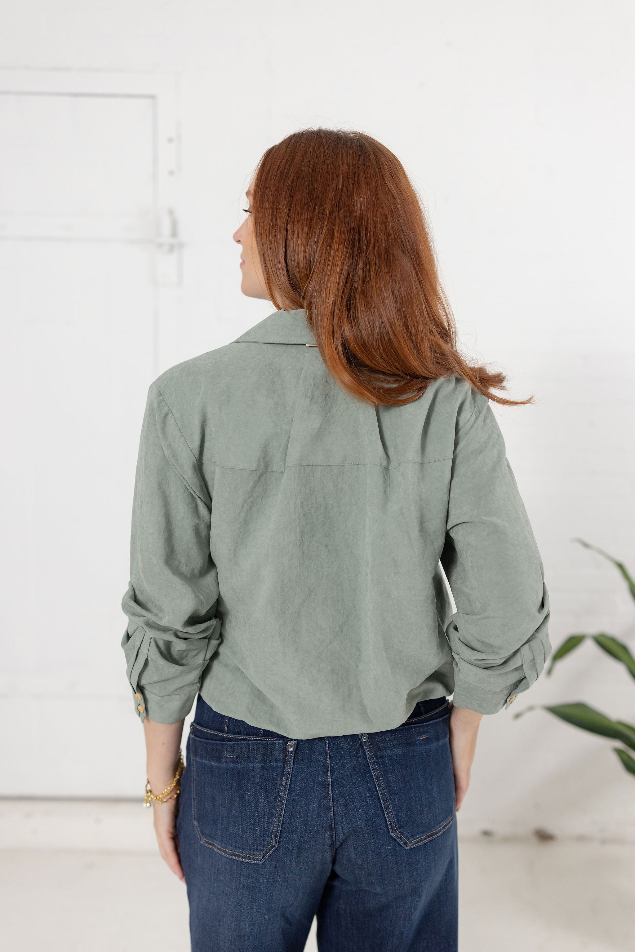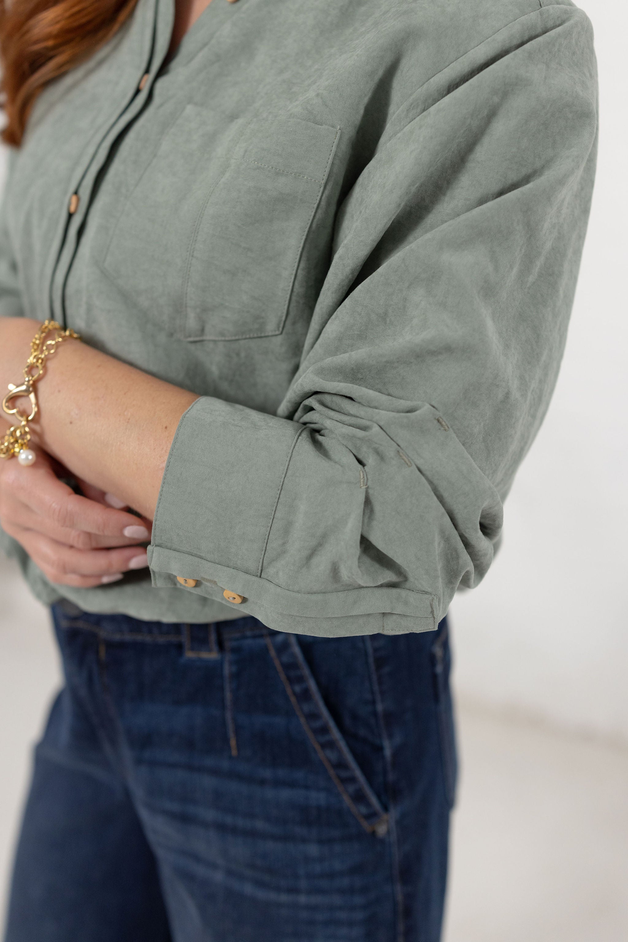 Look polished yet lowkey in this chic woven shirt, made from a soft ponte knit fabric. Three quarter tucked sleeves, a button down front, pleating, and a bubble hem add style points to every look.
