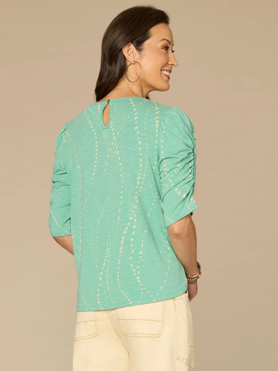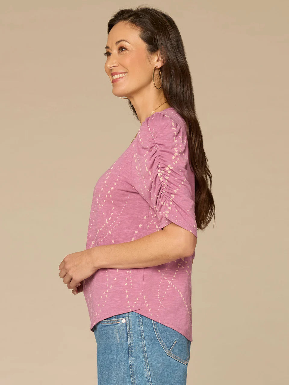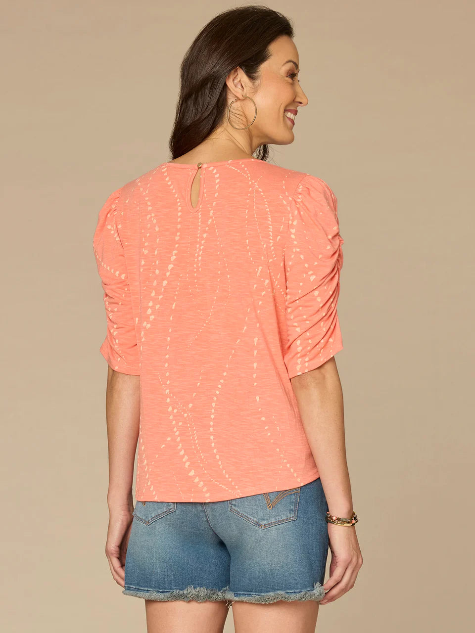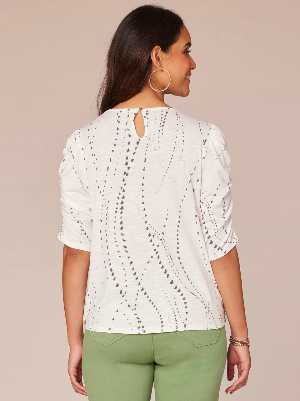 Short Sleeve Scallop V-Neck Ruched Side Twist Hem Knit Top