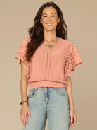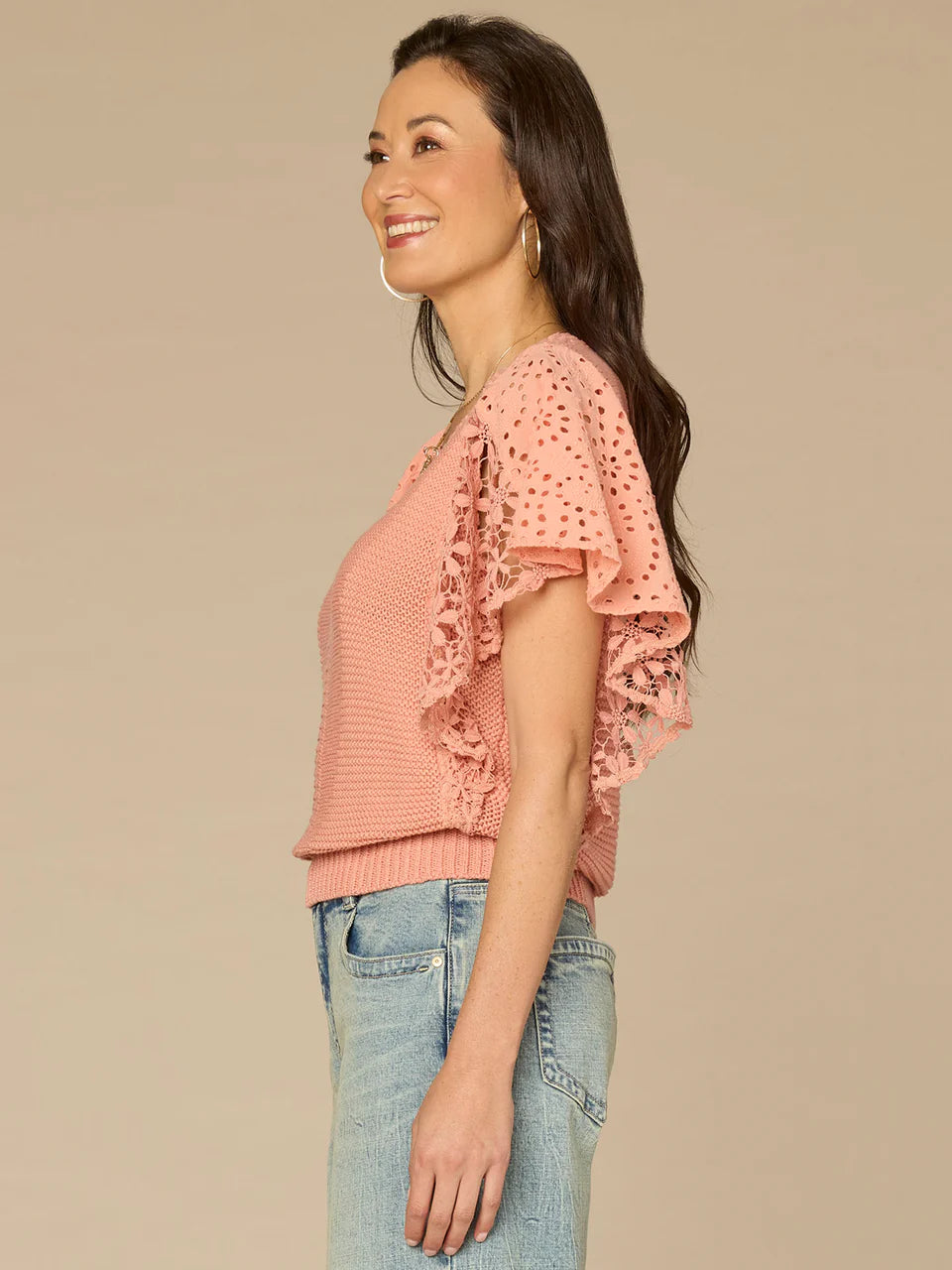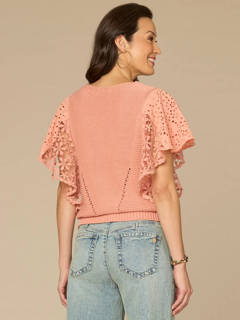 Make this mixed media sweater your go-to for breezy days and celebratory evenings. Its crochet flutter sleeves and banded hem contrast for a striking silhouette, while its V-neck and open work placket add chic elements.
