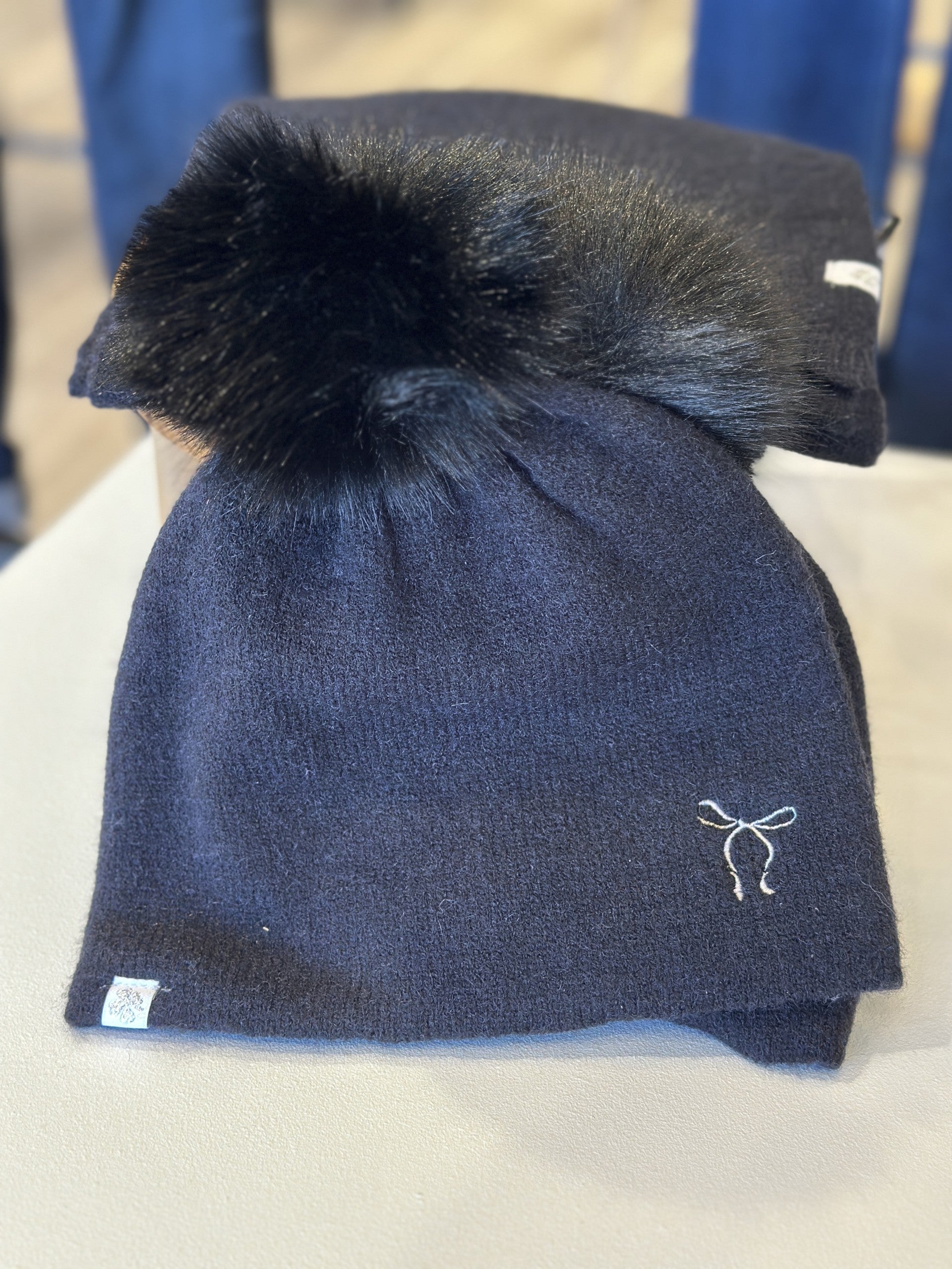 -Knitted beanie-Large pompom at the end-Embroidered bow on the side