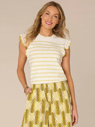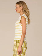 Lean into a playful twist on classic stripes with this feminine sweater top. It features crochet ruffle cap sleeves, a round neckline, banded hem, and green accents that pop against a soft off-white base.
