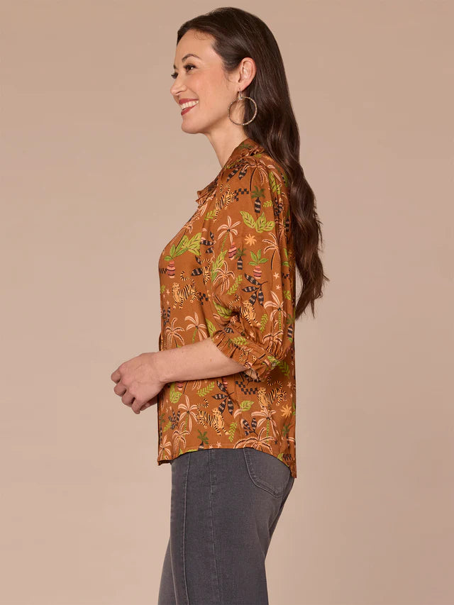 From office days to date nights, this button down woven top has your back. It features below elbow sleeves, a ruffle collar, pintuck details, and a tropical print in warm copper hues.