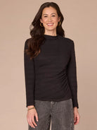 This stretchy staple knit top is a go-to for office days, brunch with your friends, or date night. It has long sleeves, a mock neck, asymmetrical side ruching, and a shirttail hem.