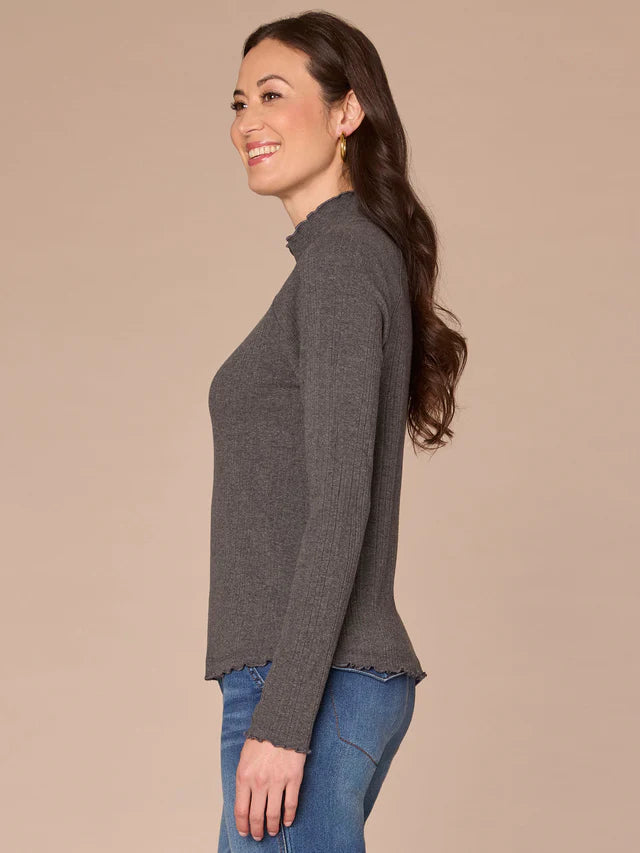 This mixed media knit top is endlessly versatile, with long sleeves, a mock neck, seaming detail, and a straight hem. Wear it on its own for an easily polished look or style it under a layer with the chic lettuce edge details popping through.