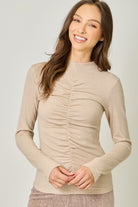 Sparkle and shine in this ruched mock neck top, featuring long sleeves and a stunning array of mini gemstones and lurex threads throughout. The dazzling embellishments create a mesmerizing shimmer effect, making this top the perfect statement piece for any special occasion. With its sophisticated ruched detailing and luminous finish, you'll be sure to turn heads wherever you go.
