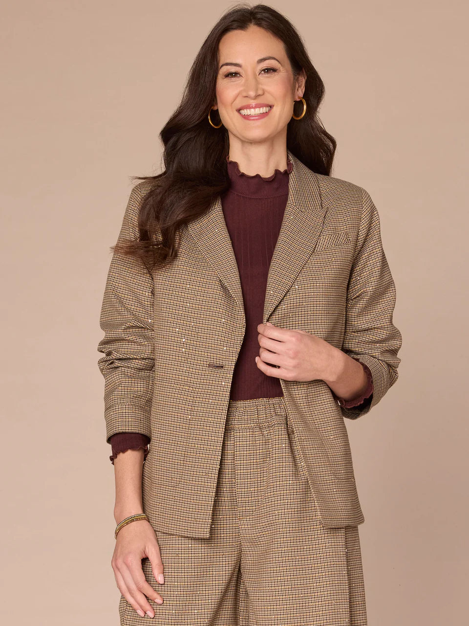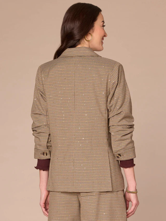 This single button blazer is all you need to upgrade your look for the office. It has three quarter ruched sleeves, princess seaming pockets, and scattered rhinestones with a herringbone pattern.