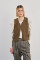 This oversized, sleeveless vest offers a relaxed and casual silhouette with its straight fit and round neckline. It features a unique button-textured mesh for a touch of refined detail, while a convenient snap button closure runs down the center front. Perfect for layering over your favorite long-sleeved shirt or light sweater, this vest effortlessly combines comfort and laid-back style.