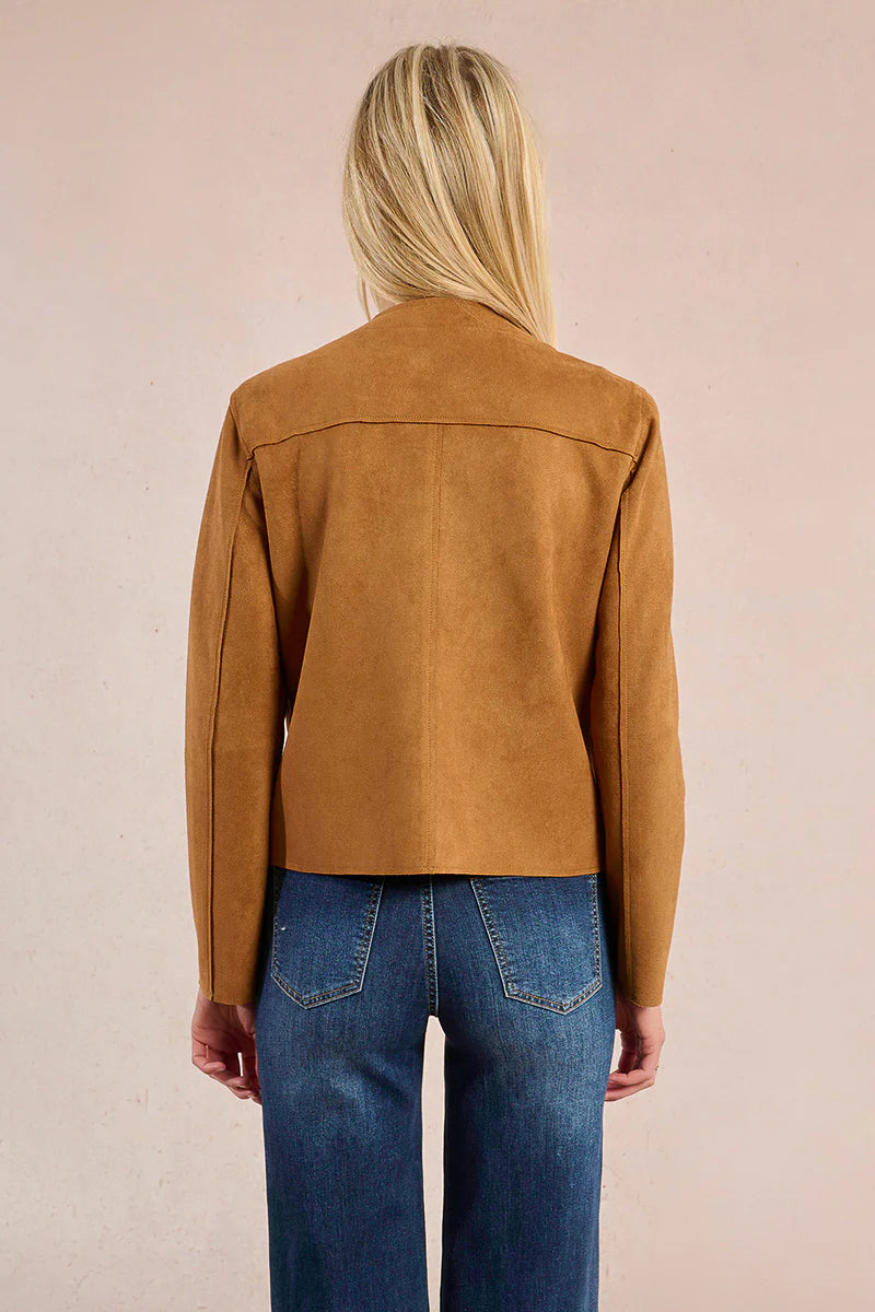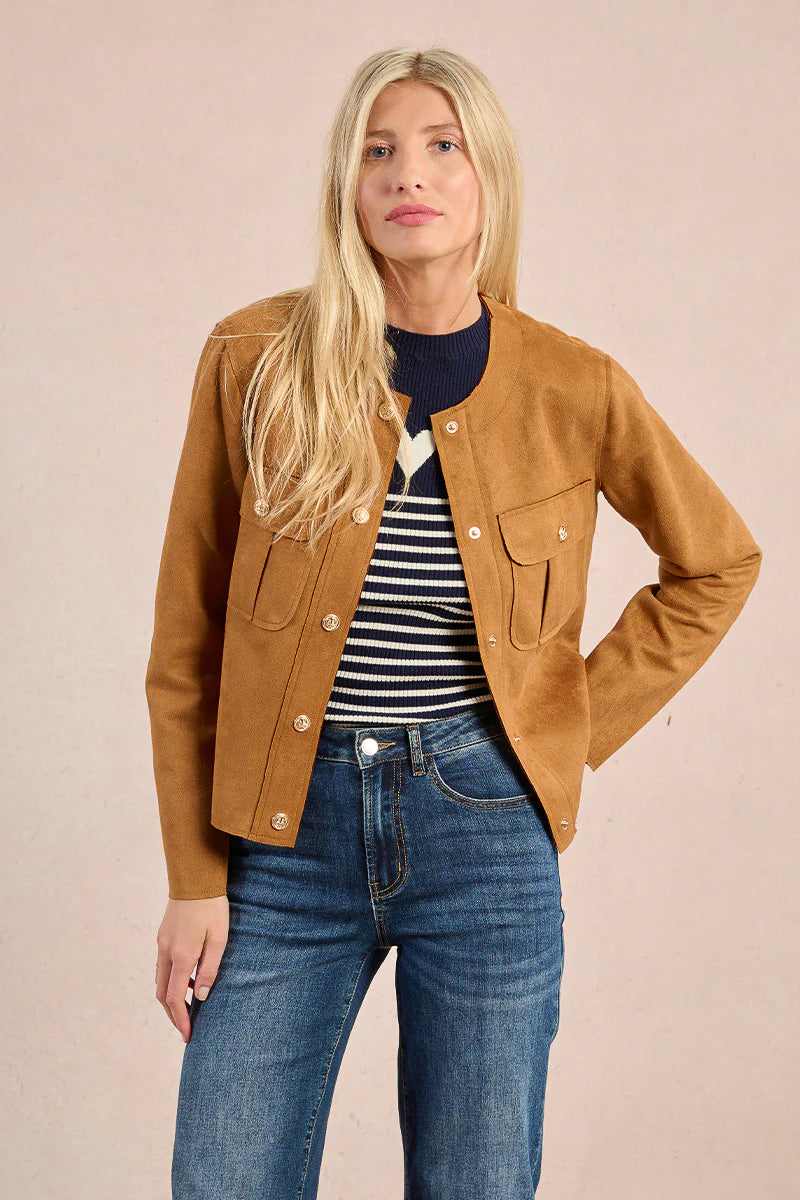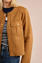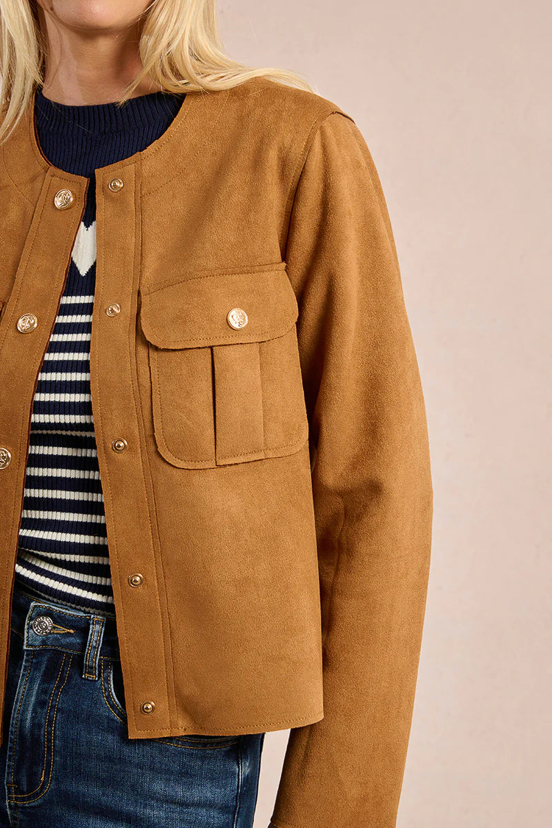 This officer-style jacket is crafted from a lightweight suede that is perfect for a straight, comfortable fit with long sleeves. Featuring a clean, round neckline and a full-length snap closure down the front, it combines effortless casual style with a touch of refinement. Functional patch pockets with flaps on the chest add to its military-inspired design while providing practical storage.