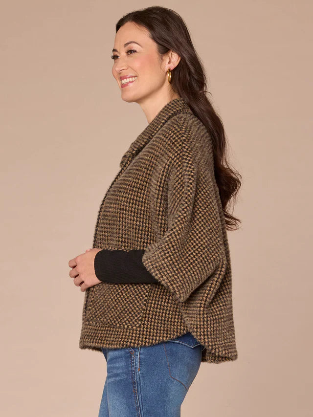 This woven capelet is so soft, you won’t want to take it off. It has a wide collar, snap front, patch pockets, and an abstract plaid design, all in a fur-like fabric.