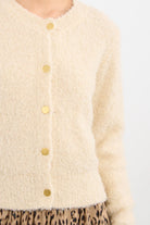 This soft textured knit cardigan is a versatile layering piece for any wardrobe, featuring a classic round neckline and long sleeves for a timeless look. The contrast buttons down the front add a stylish detail, while the ribbed finishing on the neckline, cuffs, and hem provides a comfortable and polished finish. Perfect for transitioning between seasons, this cardigan offers a cozy and chic feel that can be dressed up or down.