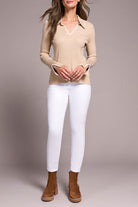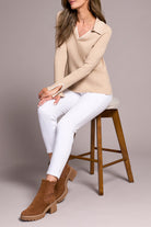 This super soft polo sweater elevates a classic design with a unique and sophisticated touch. Crafted with a breathable, yet warm blend, it offers exceptional comfort for all-day wear. The distinctive blanket stitch detail around the V-neckline and on the sleeve slits sets this sweater apart, adding a touch of artisanal charm to its polished aesthetic