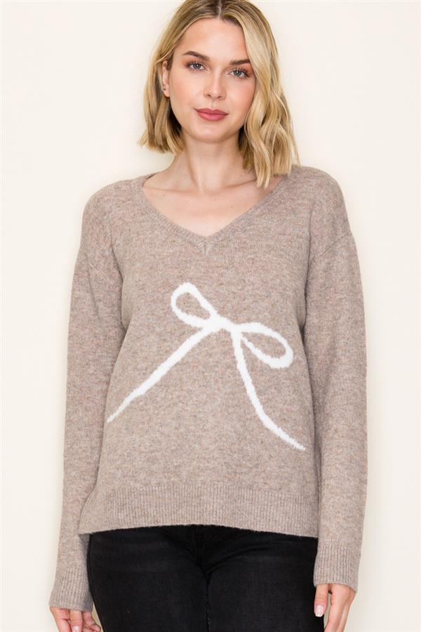 V Neck Pullover Sweater with Bow Detail