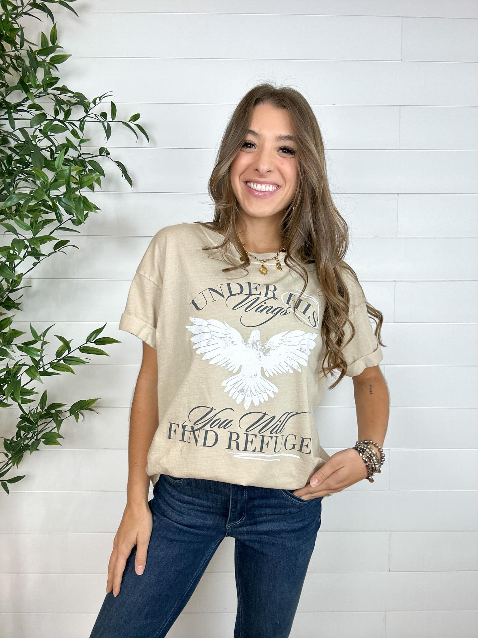 The inspiration and words from this tee is from Psalm 91:4, "He will cover you with his feathers, and under his wings you will find refuge; his faithfulness will be your shield and rampart." (NIV). Designed in neutral colors for fall and a positive reminder - our goal with all Mac and Me tees.