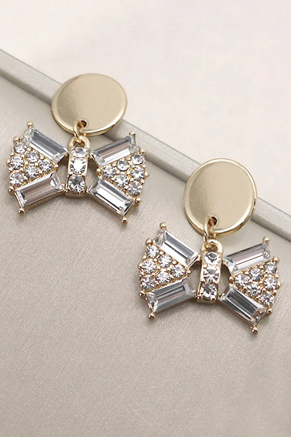 Classic Gold Stud Earrings with Rhinestone Bow Drop, a timeless blend of sophistication and charm. These earrings feature a sleek gold stud design complemented by a delicate bow adorned with shimmering rhinestones. The lightweight construction ensures comfort, while the secure closure ensures they stay in place throughout wear.