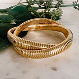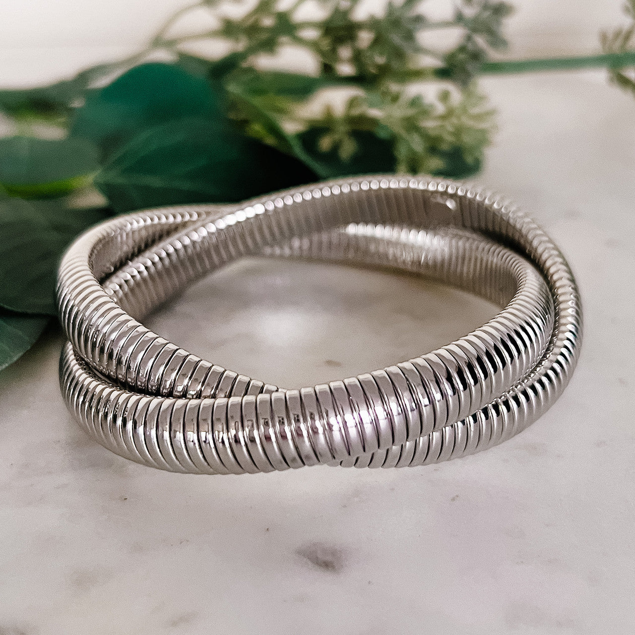 Sleek and modern, this snake chain bangle brings understated edge to your accessory game. With its smooth, flexible design and high-shine finish, it wraps the wrist with a fluid, sculptural feel. Wear it solo for a minimalist statement or layer it with other pieces for a bold, stacked look.