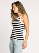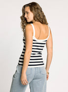 This ribbed stripe tank with a low back offers a chic, modern twist on a classic summer staple. Designed with a fitted, stretchy silhouette, it hugs comfortably while showcasing a flattering low-back detail. Perfect for layering or wearing on its own, it pairs effortlessly with shorts, skirts, or denim.