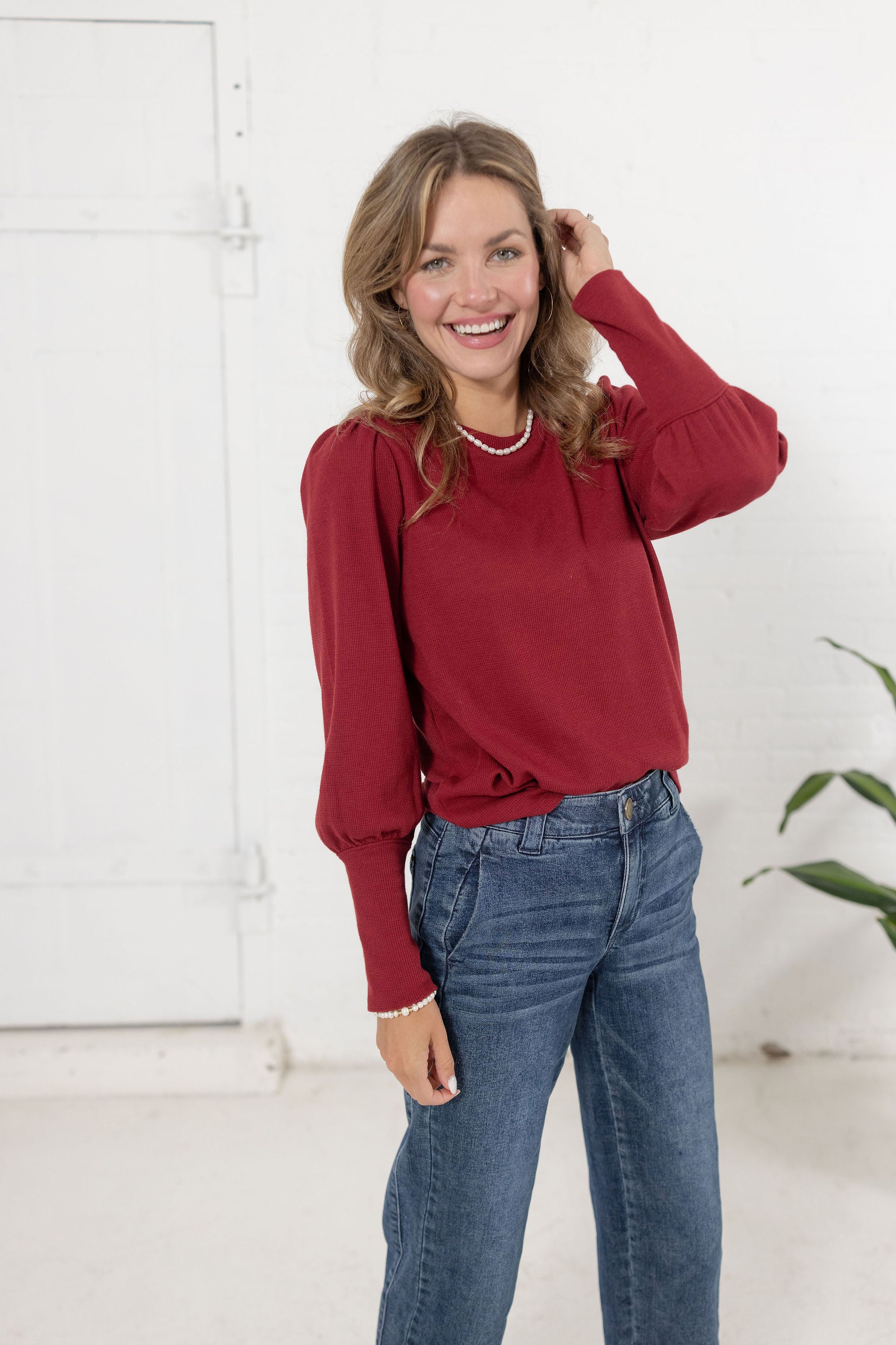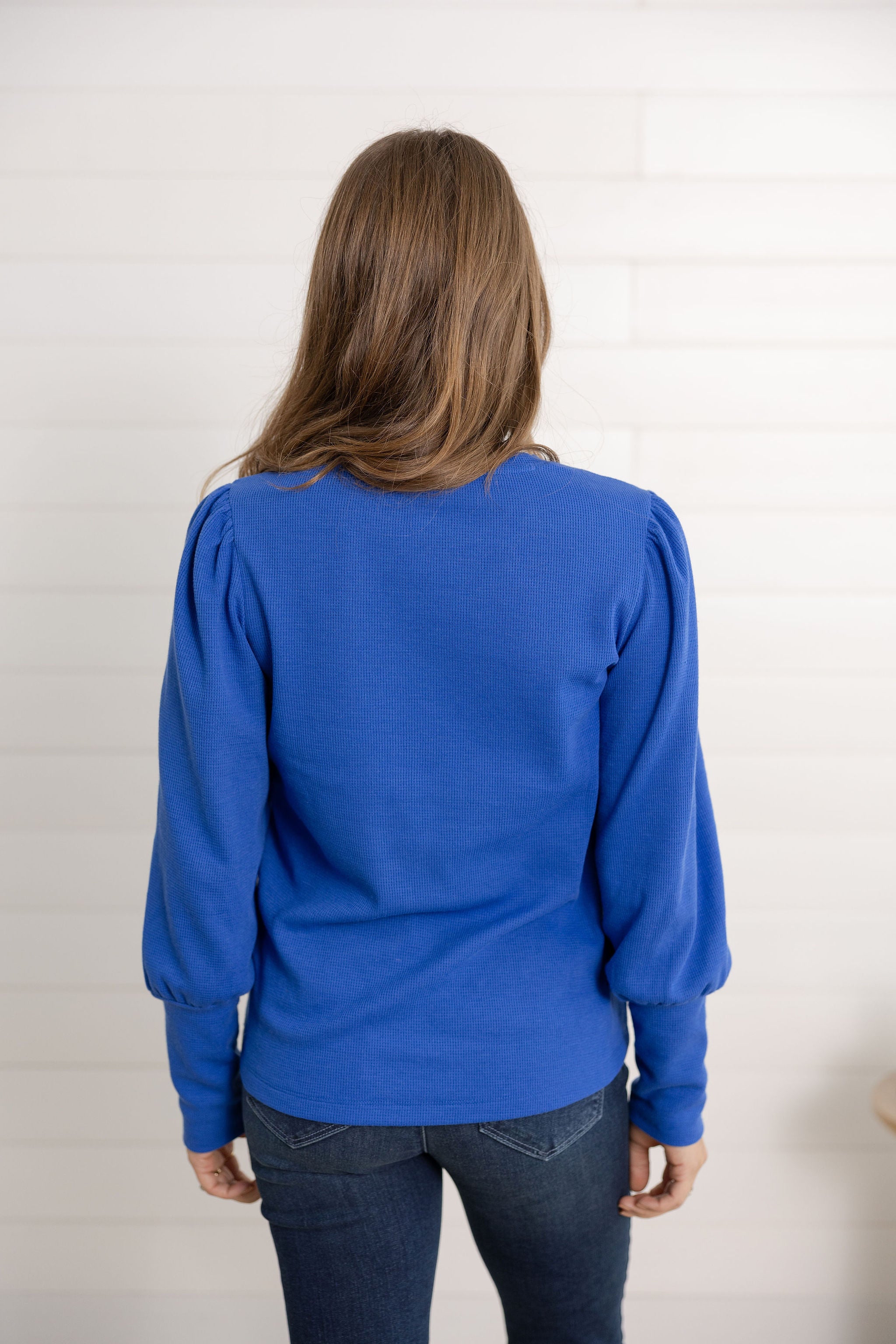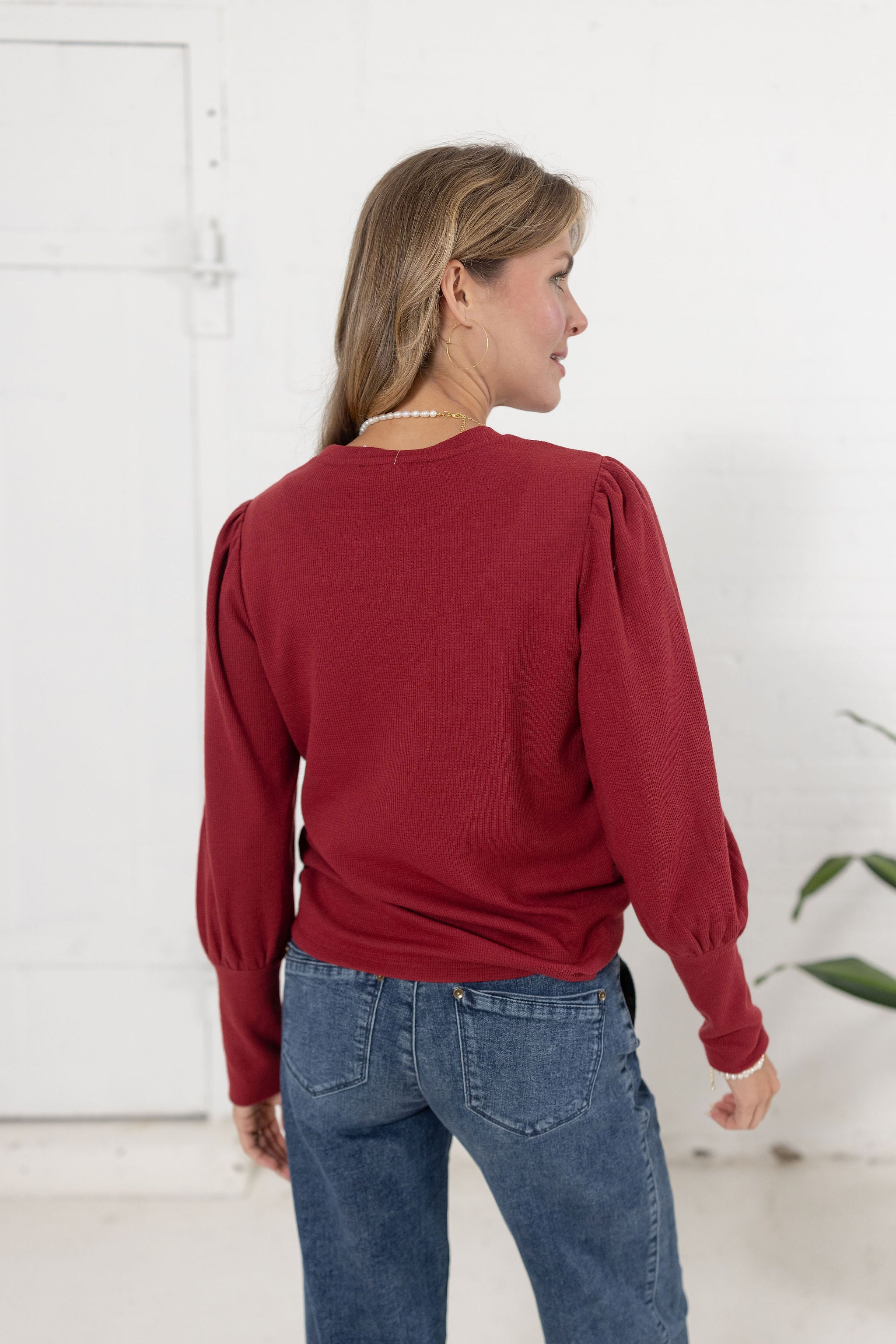 A ribbed long sleeve top with gathered shoulder detail for a touch of feminine style. Comfortable with a hint of texture, it’s perfect for layering or wearing on its own.