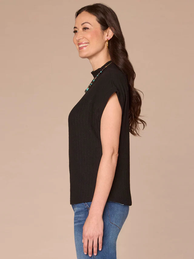 Extended Cap Sleeve Mock Neck Curved Placket Knit Top