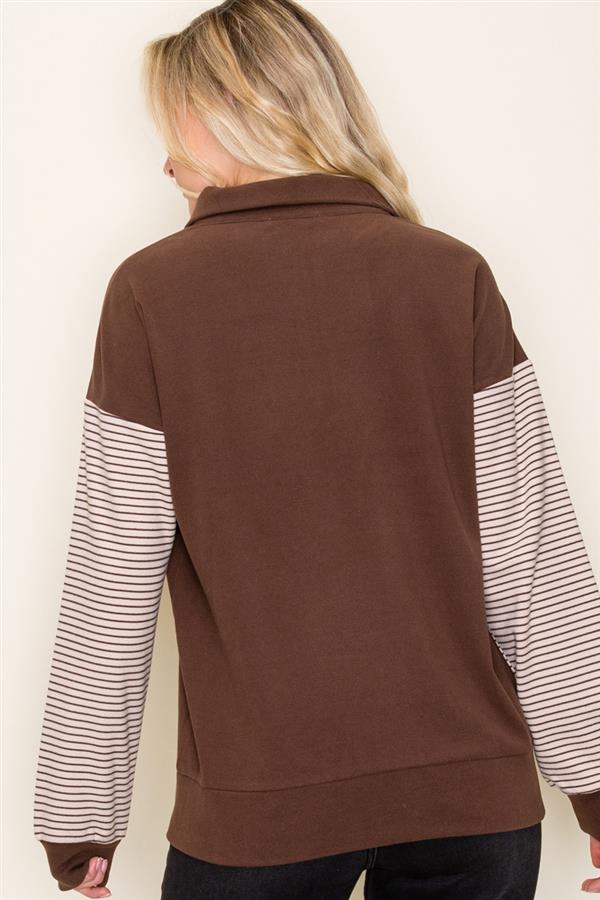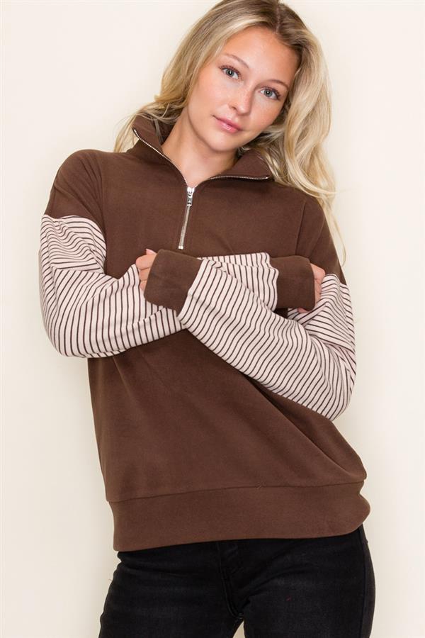 Combining cozy comfort with sporty style, this half-zip sweatshirt features a soft knit fabric and fashionable striped sleeves. The versatile half-zip neckline allows for multiple styling options, making it the perfect piece for any casual occasion. Effortlessly pair it with your favorite denim or leggings for a chic and comfortable look all season long.