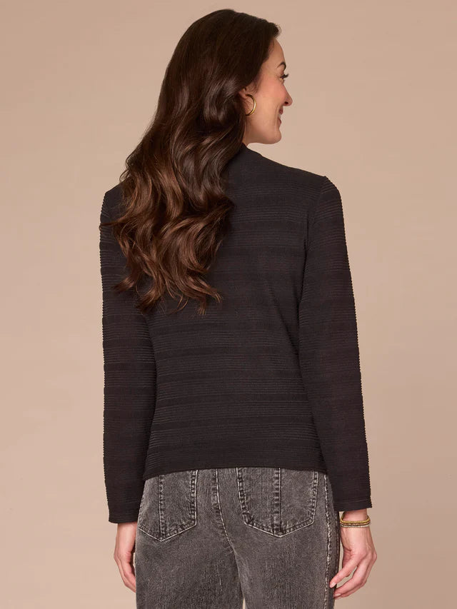 This stretchy staple knit top is a go-to for office days, brunch with your friends, or date night. It has long sleeves, a mock neck, asymmetrical side ruching, and a shirttail hem.