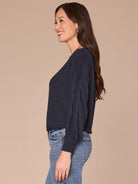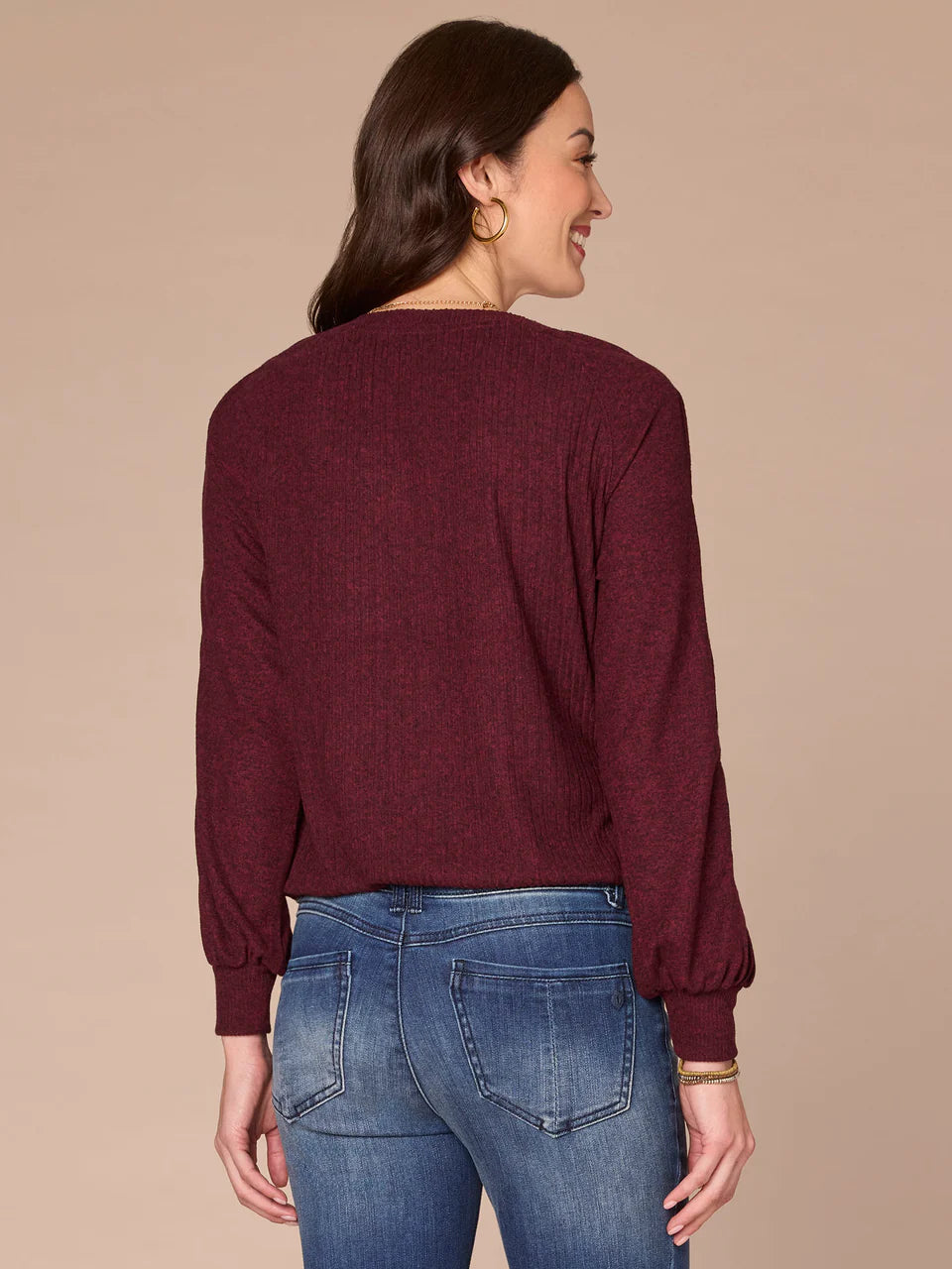 For a feminine silhouette and flirty details, reach for this soft ribbed knit top. It features long blouson sleeves, a sweetheart neck, pintucking details, and a cased hem.