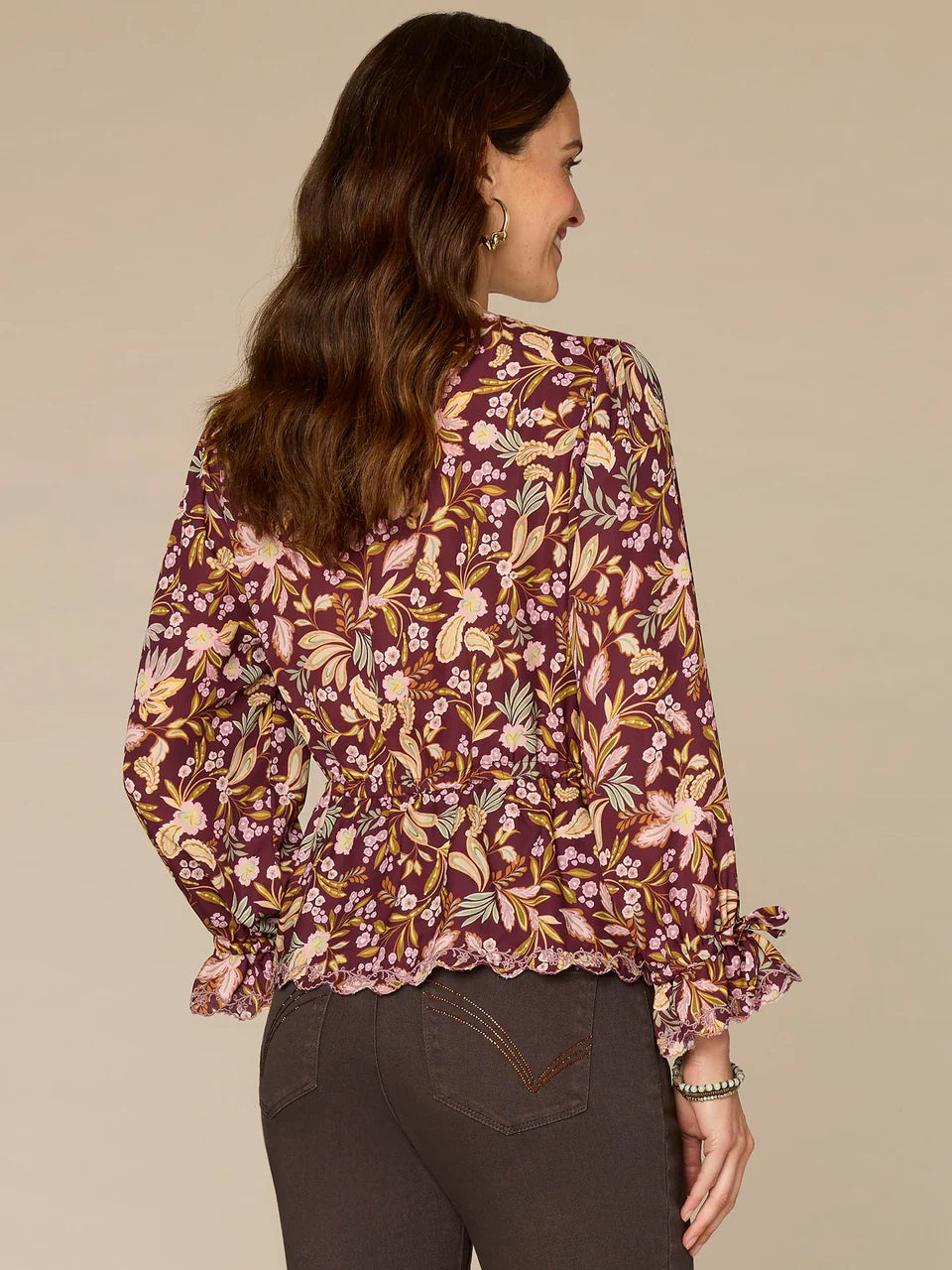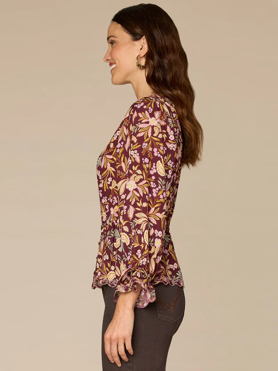 *FINAL SALE* Tie Sleeve V-Neck Printed Top with Scallop Edge Embroidery