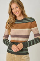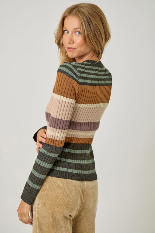 This cozy ribbed sweater top features a playful and modern mix of color-blocking and stripes, perfect for brightening up any outfit. Crafted with a soft knit fabric and relaxed fit, it offers all-day comfort for effortless, versatile wear. The stylish design and ribbed texture make it an easy go-to for pairing with your favorite jeans.
