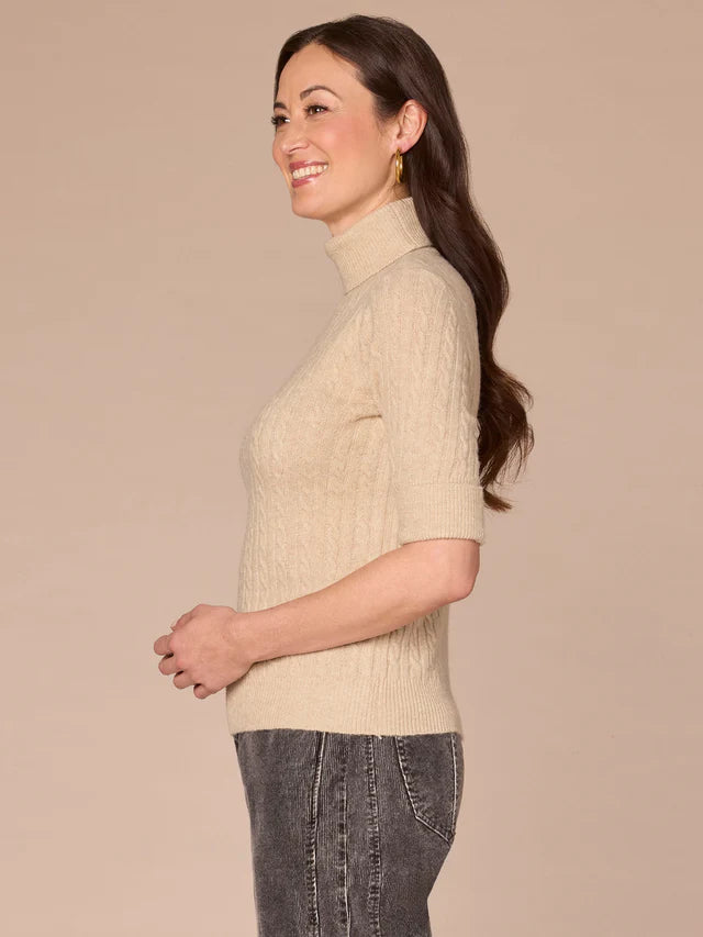 This modern take on the timeless turtle neck sweater is flattering, feminine, and extremely versatile. It has elbow-length cuff sleeves, a cable stitch mix design, and a straight hem.
