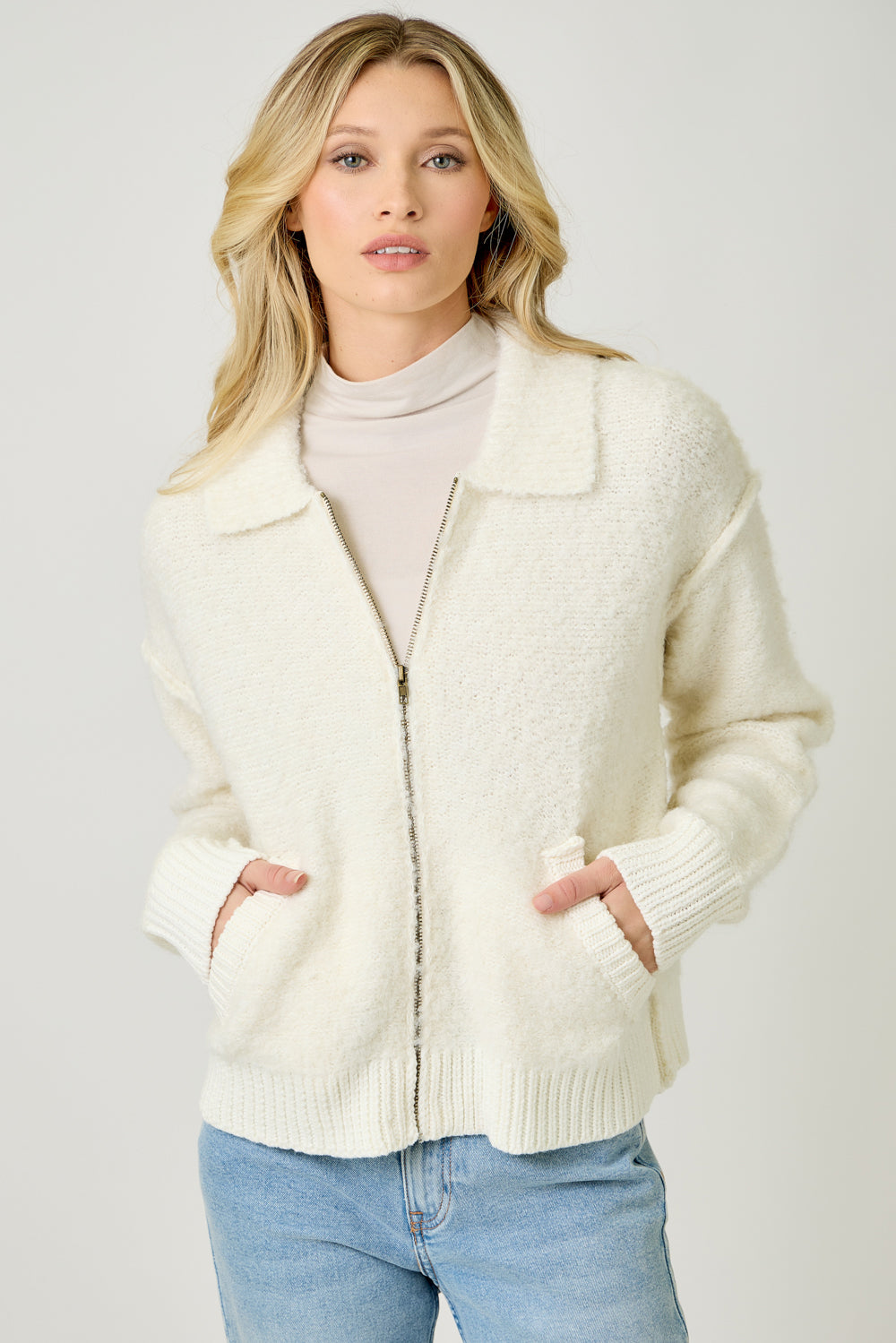 Elevate your style with this classic full-zip sweater jacket, featuring a sophisticated collared design for a polished, versatile look. Its soft, high-quality knit provides comfortable warmth, while the full zipper allows for easy layering and adaptable wear for any occasion. Perfect for transitioning between seasons, this jacket seamlessly blends timeless appeal with everyday comfort.