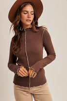 This top combines a cozy, ribbed knit texture with a playful, delicate lettuce edge trim at the hem and cuffs for a touch of feminine charm. The elegant mock neckline provides a sleek, polished look, making it a versatile and stylish layering piece for any occasion. Crafted from a soft and stretchy fabric, this fitted silhouette offers both comfort and a flattering shape.