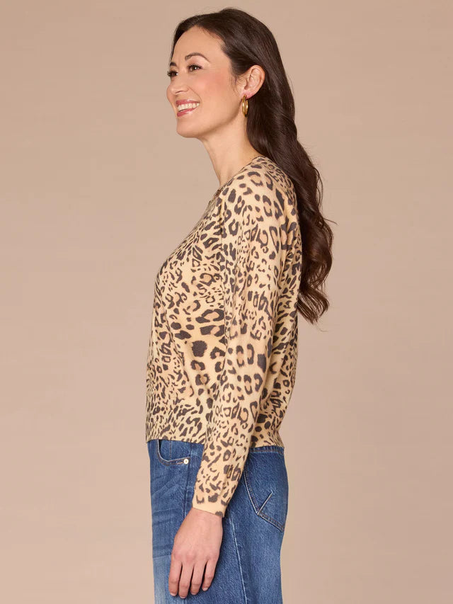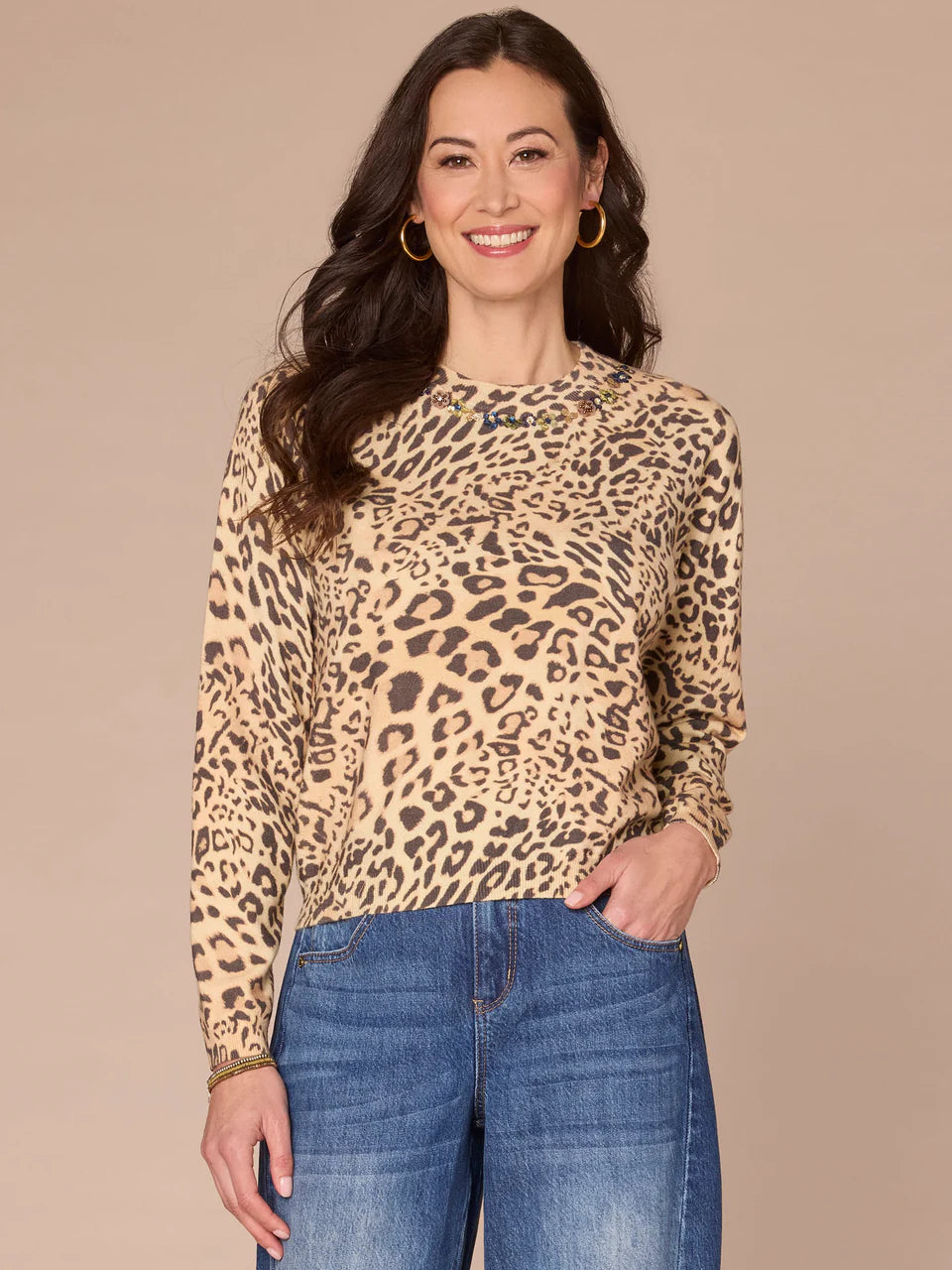 Long Sleeve Round Sequin Embroidered Neck Animal Print Sweater
